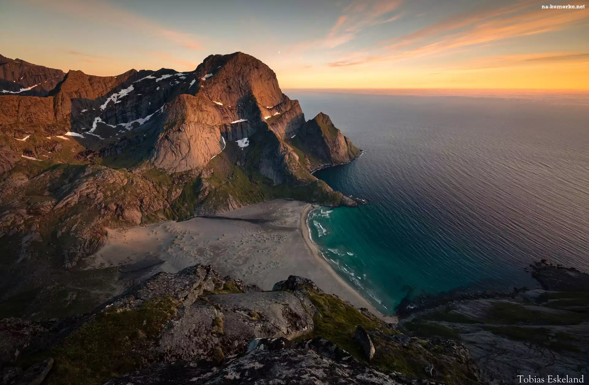 Dunes, Plaża, Góry, Morze Norweskie, Szczyt, Norwegia, Bunesstranda, Lofoty, Helvetestinden, Zachód słońca na Komórkę |