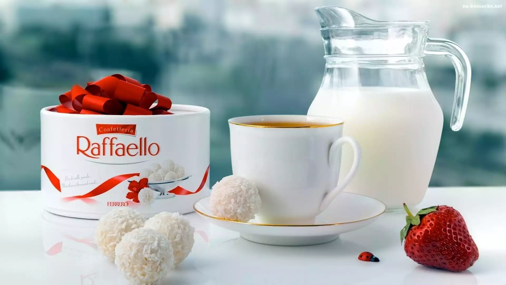 Kompozycja, Herbata, Truskawka, Słodycze, Raffaello, Mleko, Filiżanka na Komórkę