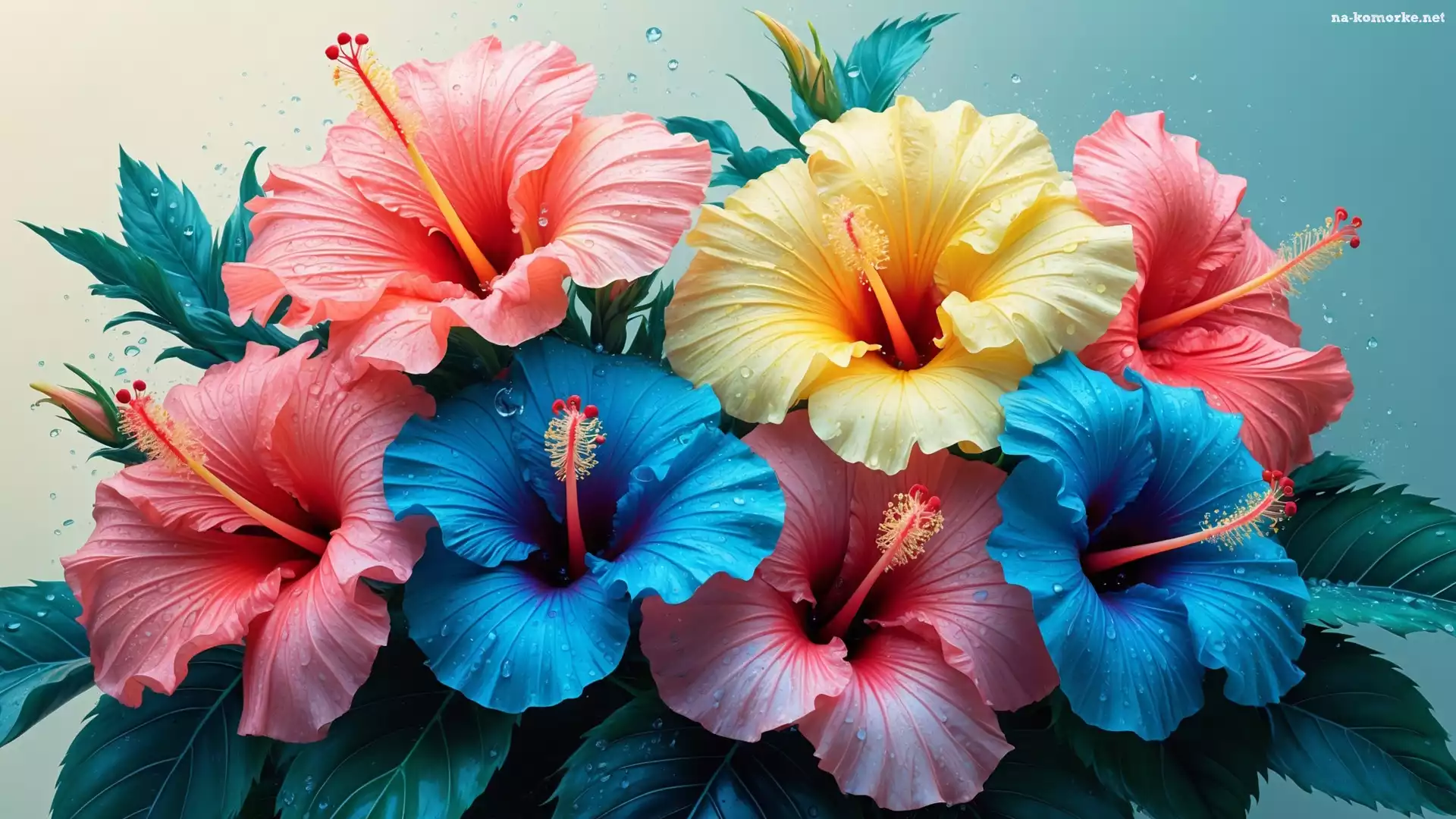 Różowe, Krople, Żółty, Kwiaty, Liście, Grafika, Niebieskie, Hibiskusy na Komórkę