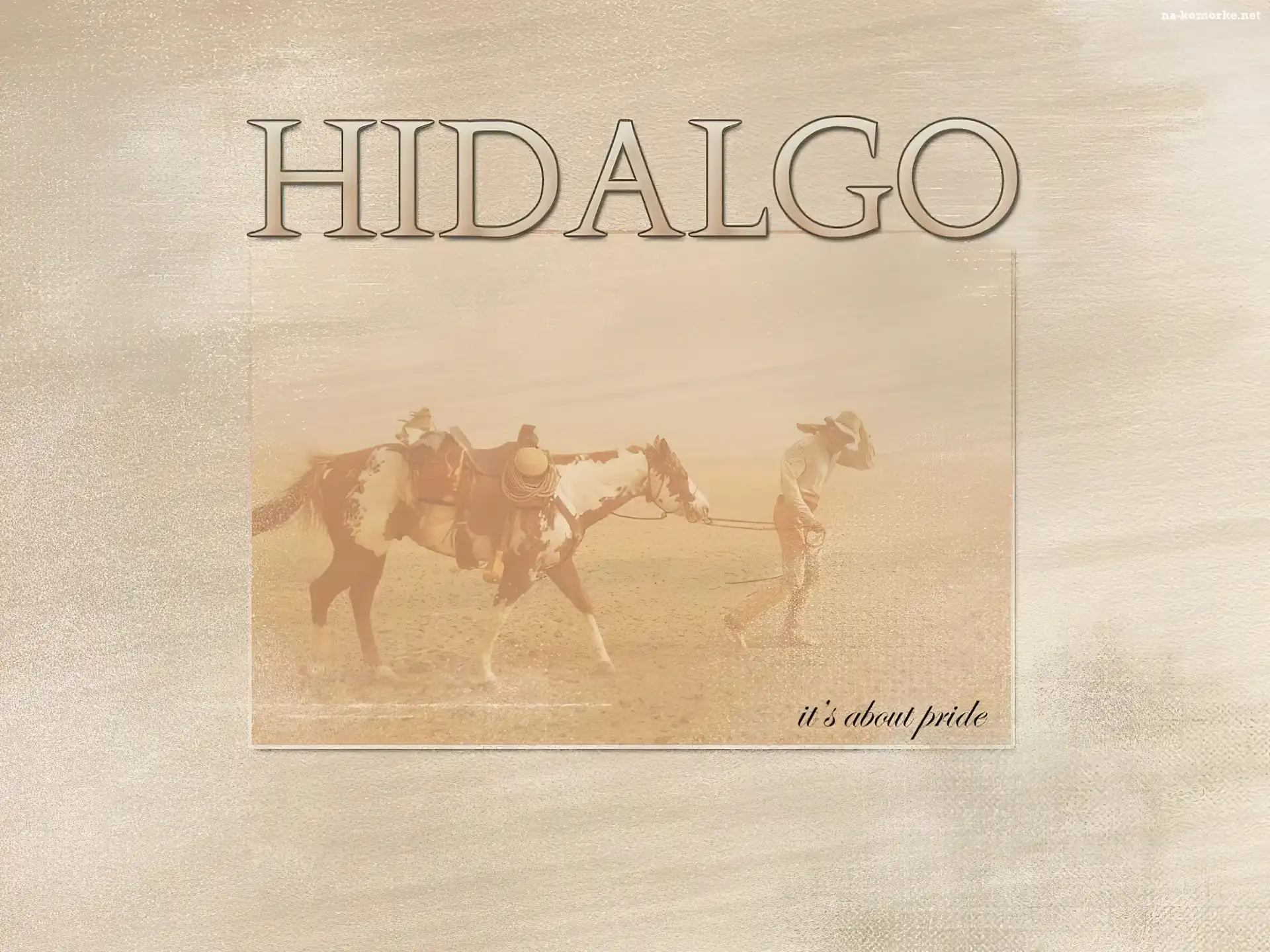 Hidalgo, pustynia, człowiek, koń Hidalgo, kowboj, napis Hidalgo, obrazek, koń