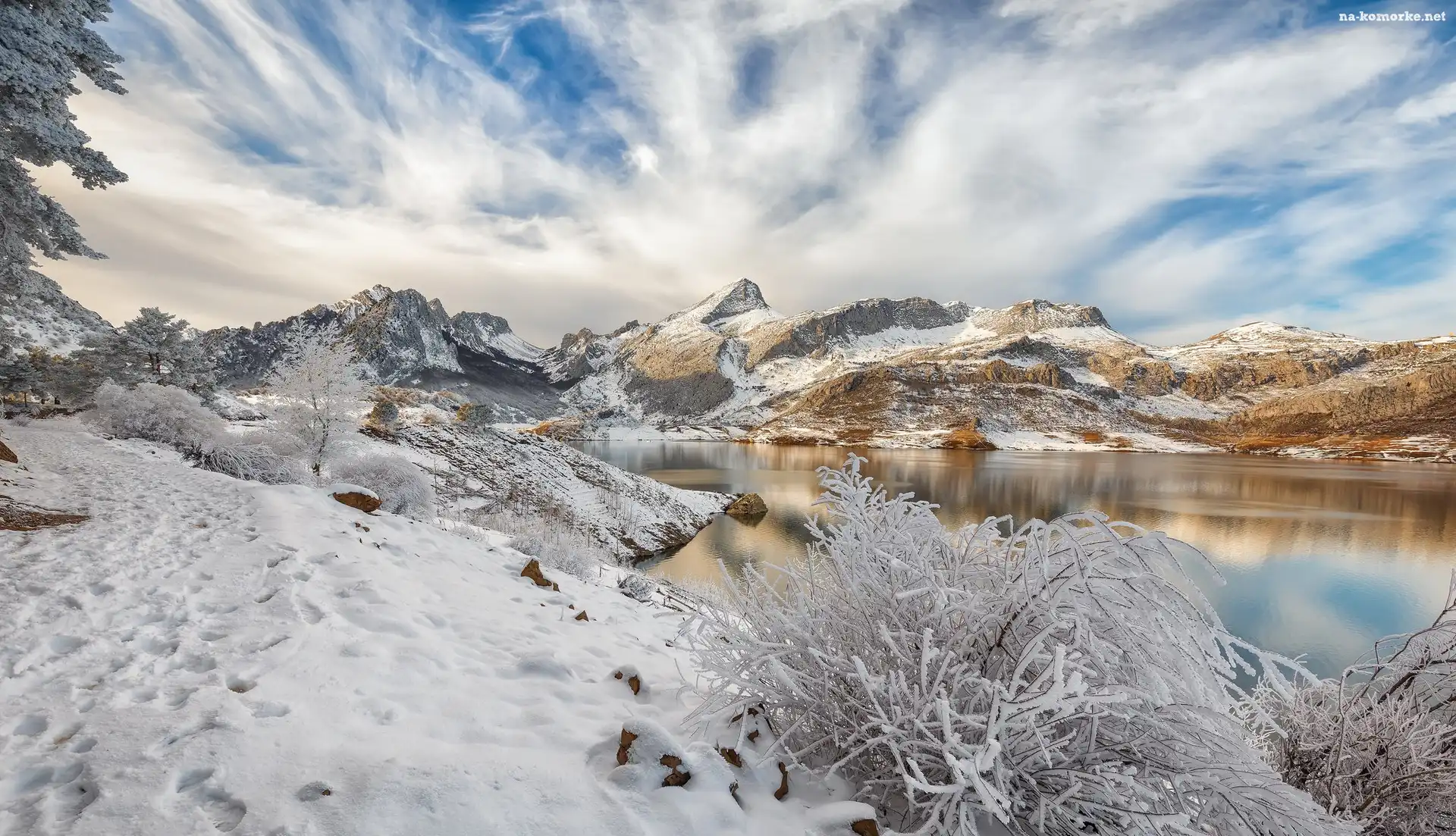 Hiszpania, Drzewa, Jezioro Embalse de Riaño, Åšnieg, Kastylia i León, Zima, Góry, Krzewy na KomórkÄ™ |
