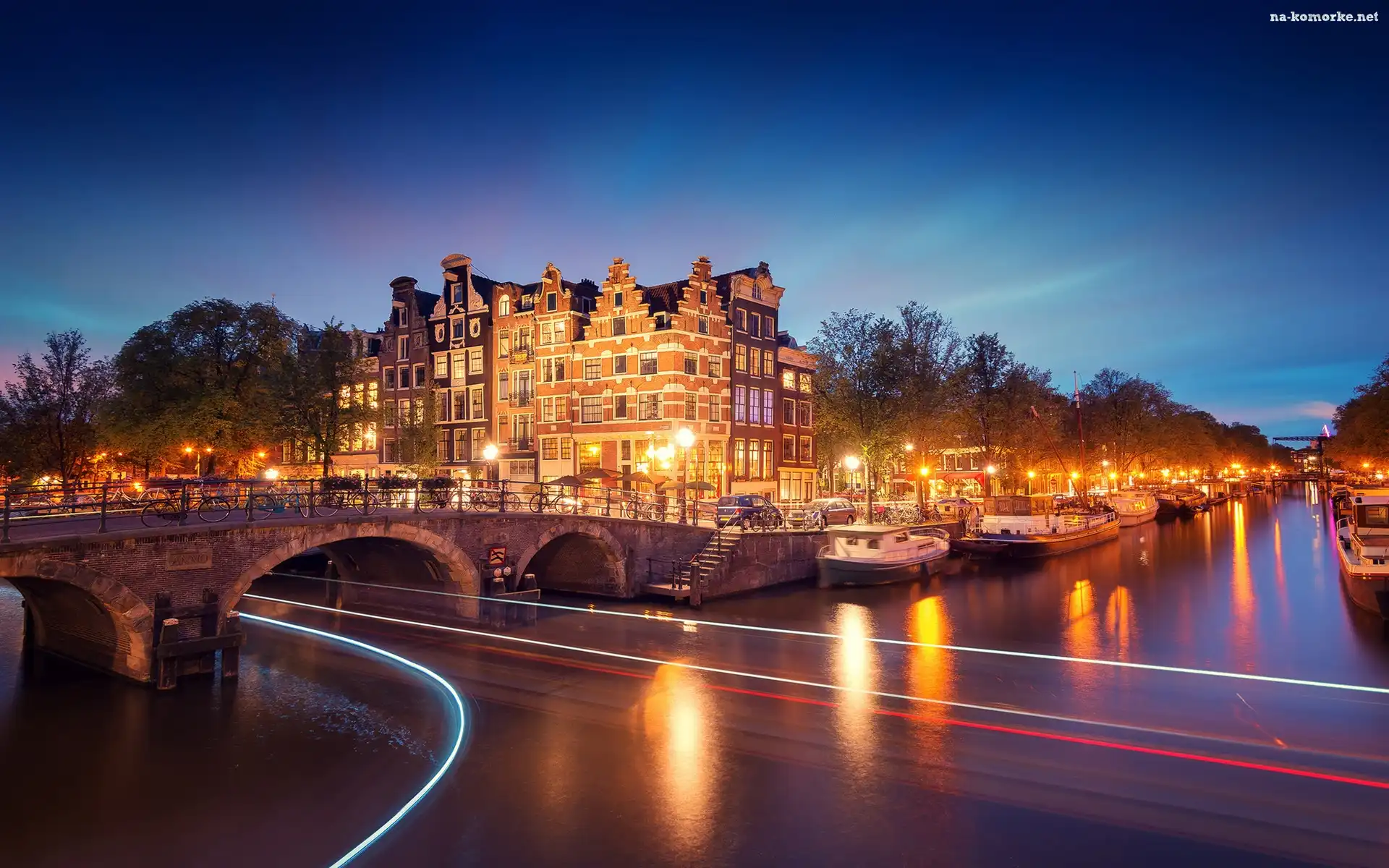 Rzeka, Holandia, Budynki, Noc, Most, Łodzie, Barki, Amsterdam na Komórkę
