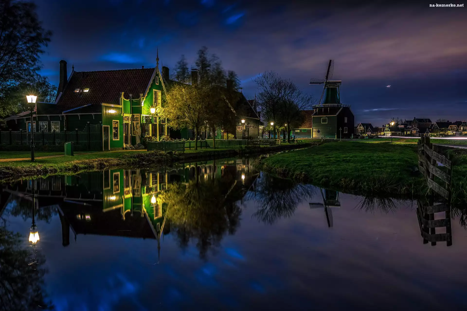 Dom, Holandia, Zaanse Schans, Odbicie, Noc, Wiatrak na Komórkę