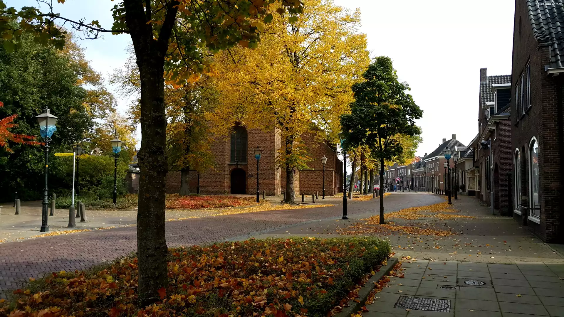 Holandia, Kamienice, Jesień, Ulica na Komórkę