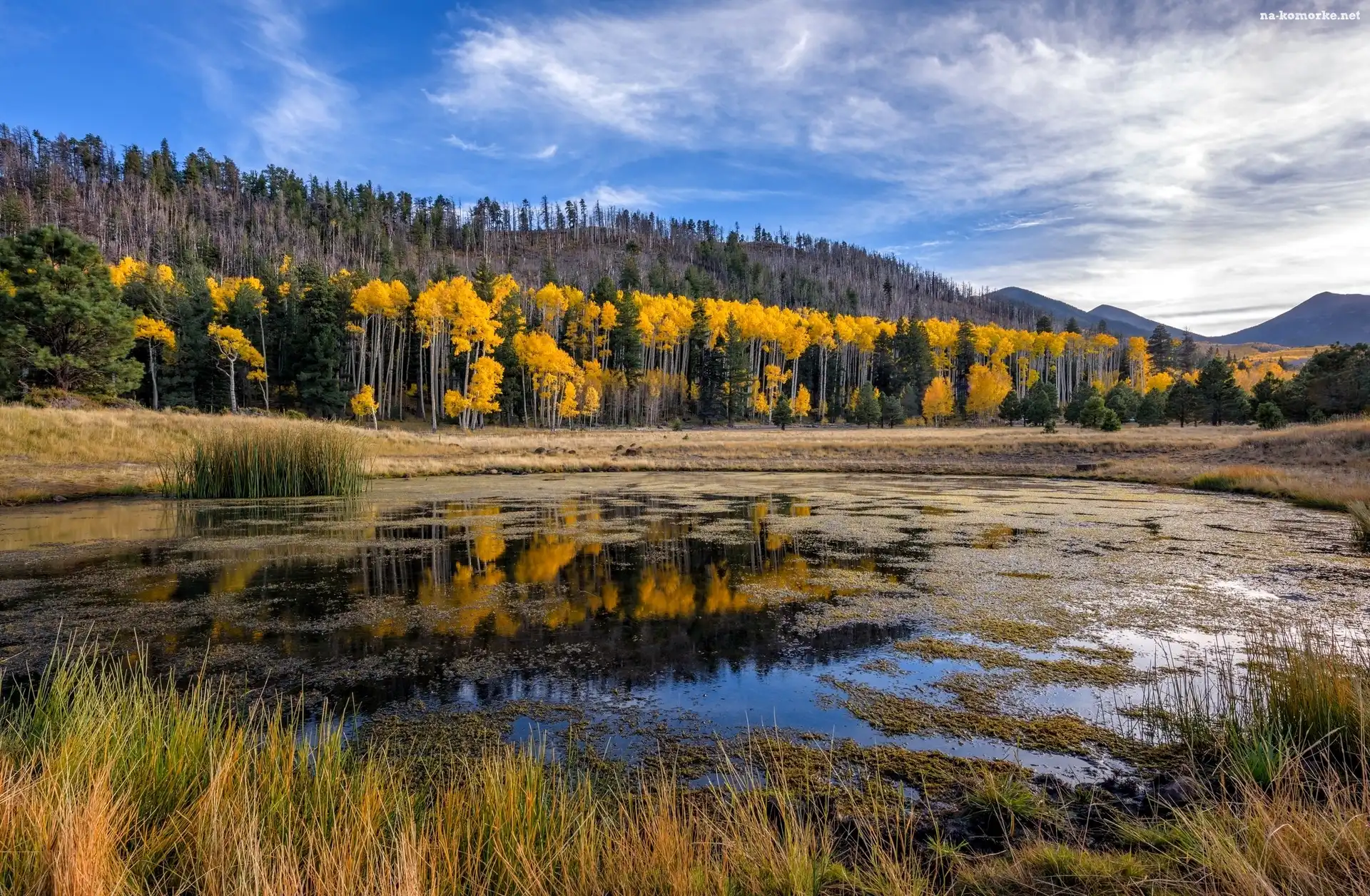 Hrabstwo Coconino, Stany Zjednoczone, Jesień, Wzgórza San Francisco Peaks, Trawy, Stan Arizona, Rozlewisko, Kemping Lockett Meadow, Drzewa na Komórkę |