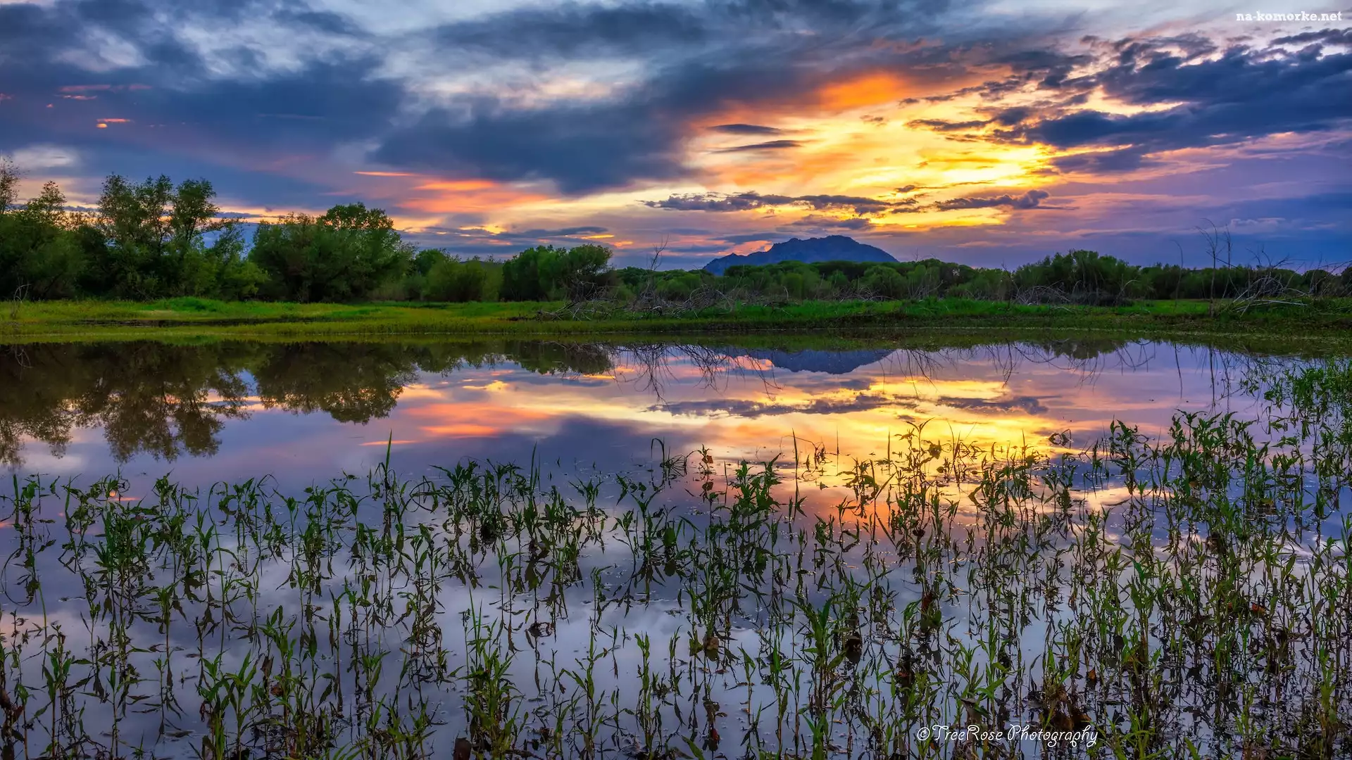 Hrabstwo Yavapai, Stany Zjednoczone, Willow Lake, Prescott, Odbicie, Arizona, Zachód słońca, Jezioro, Trawy na Komórkę |