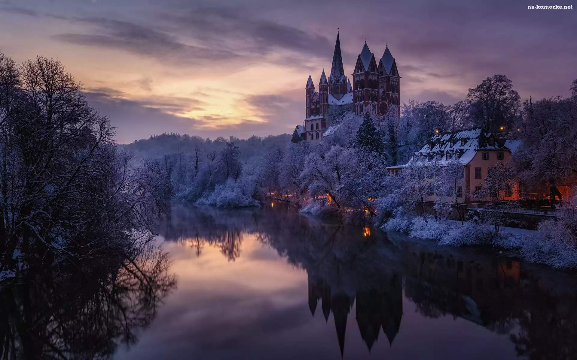 Dom, Oszronione, Niemcy, Drzewa, Rzeka Lahn, Katedra Świętych Jerzego i Mikołaja, Limburg na Komórkę |