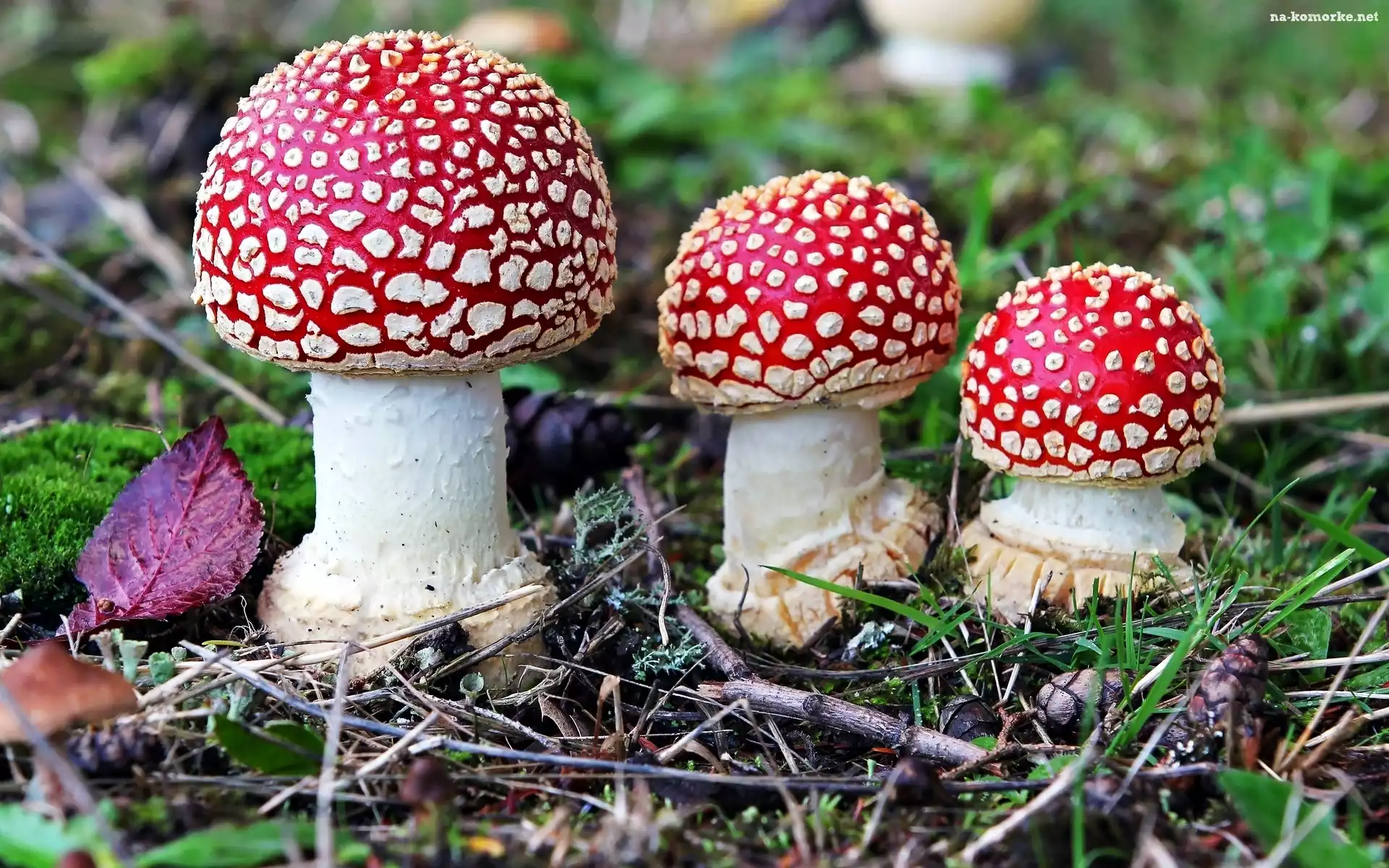 Igły, Trzy, Muchomory, Liście, Trawa na Komórkę