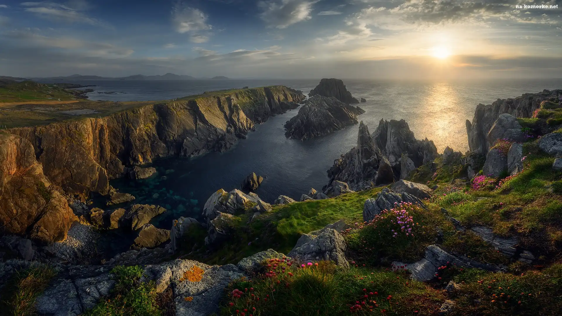 Skały, Przylądek Malin Head, Trawy, Zachód słońca, Hrabstwo Donegal, Irlandia, Kwiaty, Morze na Komórkę |
