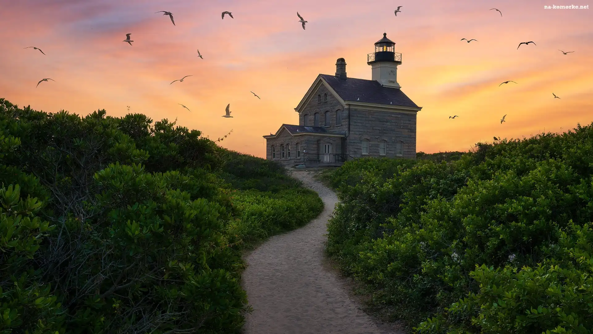 Morze, Krzewy, Latarnia morska, Stany Zjednoczone, Block Island North Light, Mewy, Droga, Stan Rhode Island na Komórkę |