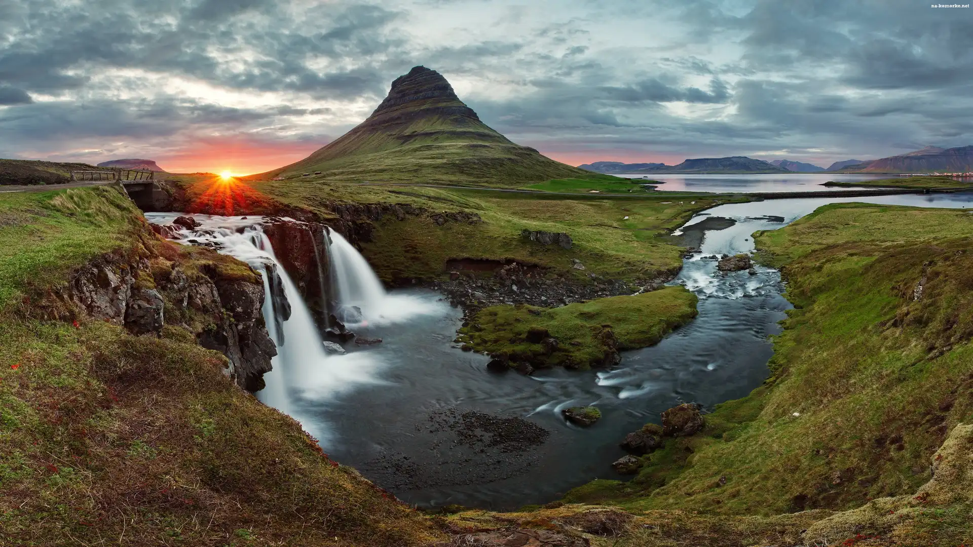 Islandia, Wodospad, Rzeka, Wschód słońca, Góry na Komórkę