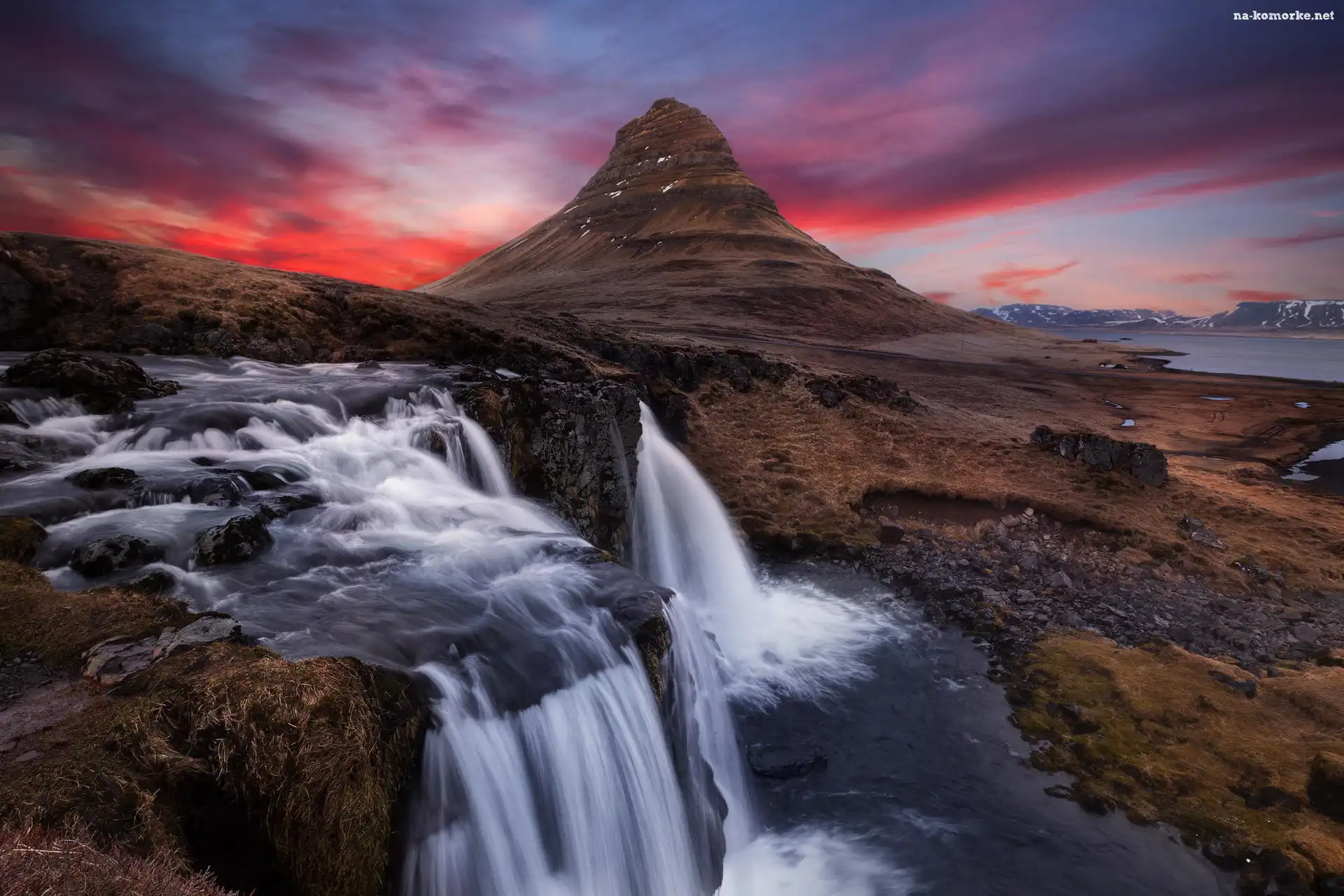 Zachód sÅ‚oÅ„ca, Islandia, Półwysep Snæfellsnes, Góra Kirkjufell, Wodospad Kirkjufellsfoss na KomórkÄ™ |