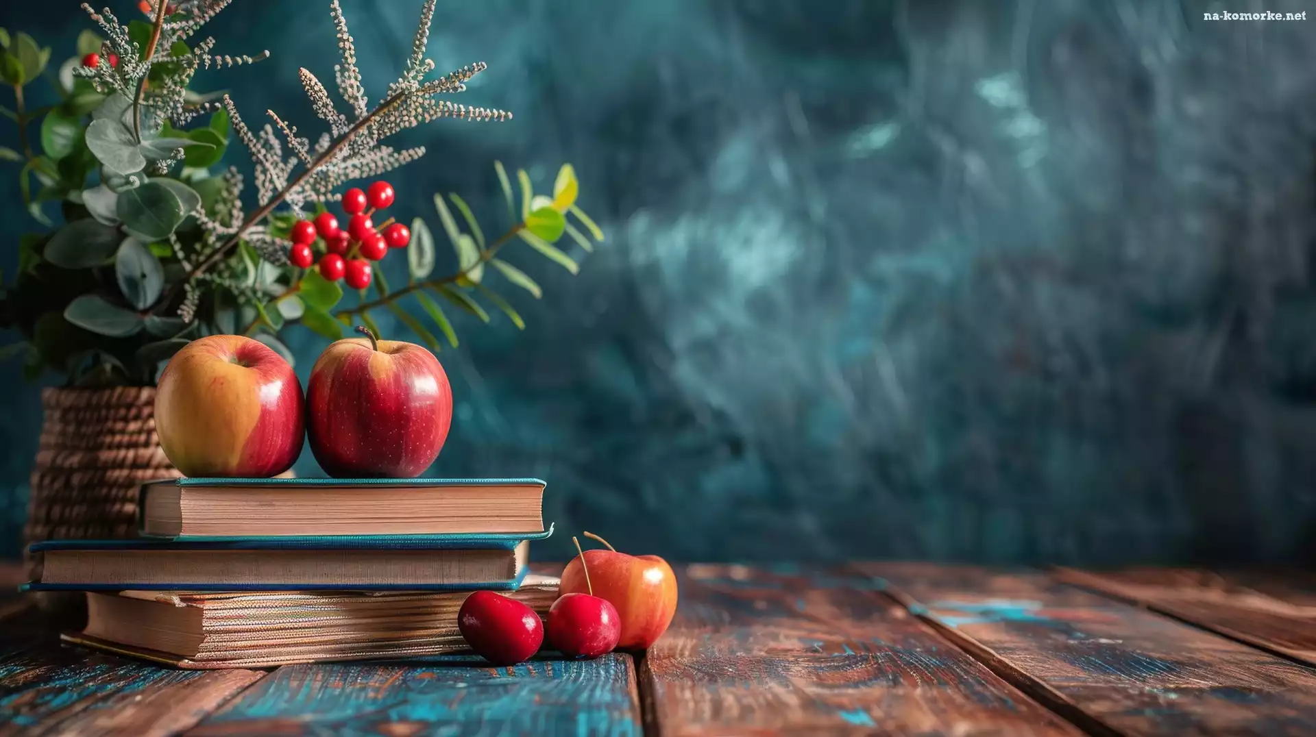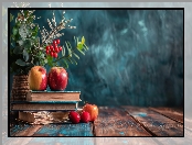 Książki, Wazon, Rośliny, Jabłka, Grafika AI na Komórkę