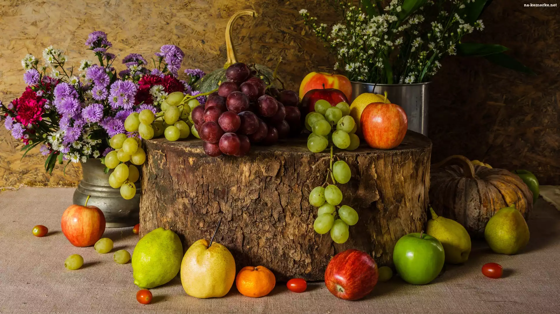 Astry marcinki, Klocek, Wazon, Drewno, Kwiaty, Owoce, Winogrona, Jabłka na Komórkę