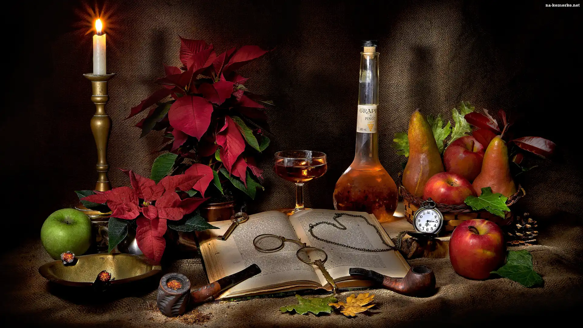 Gwiazda betlejemska, Jabłka, Kompozycja, Książka, Wino, Butelka, Świeca, Gruszki, Zegarek, Fajka na Komórkę |