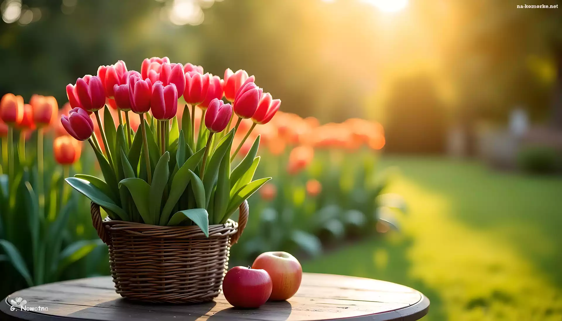 Tulipany, Jabłka, Stolik, Koszyk, Grafika na Komórkę