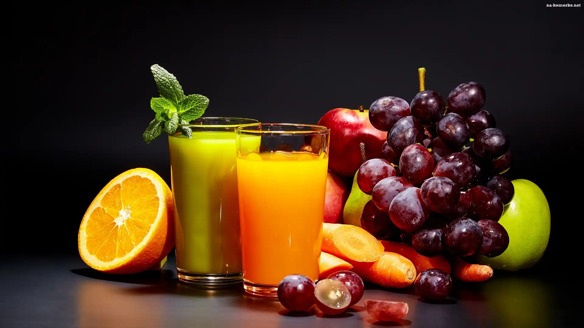 Jabłka, Szklanki, Sok, Pomarańcza, Winogrono, Marchew na Komórkę
