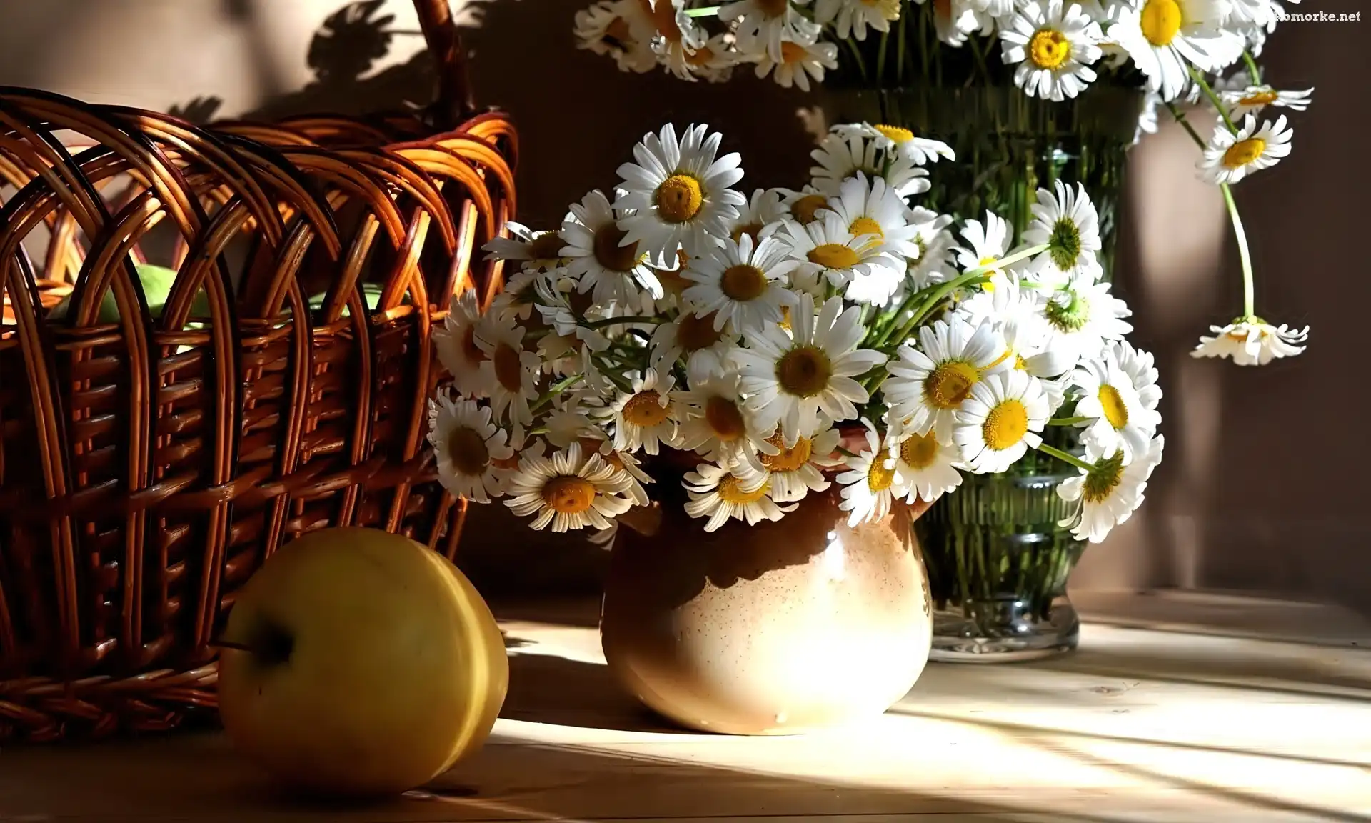 Jabłko, Kwiaty, Rumianki, Kosz, Wazon na Komórkę