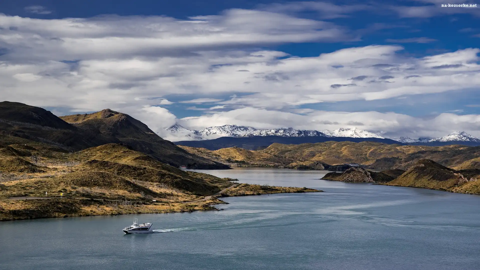 Chile, Jezioro Lake Pehoe, Jacht, Park Narodowy Torres del Paine, Góry Cordillera del Paine na Komórkę |