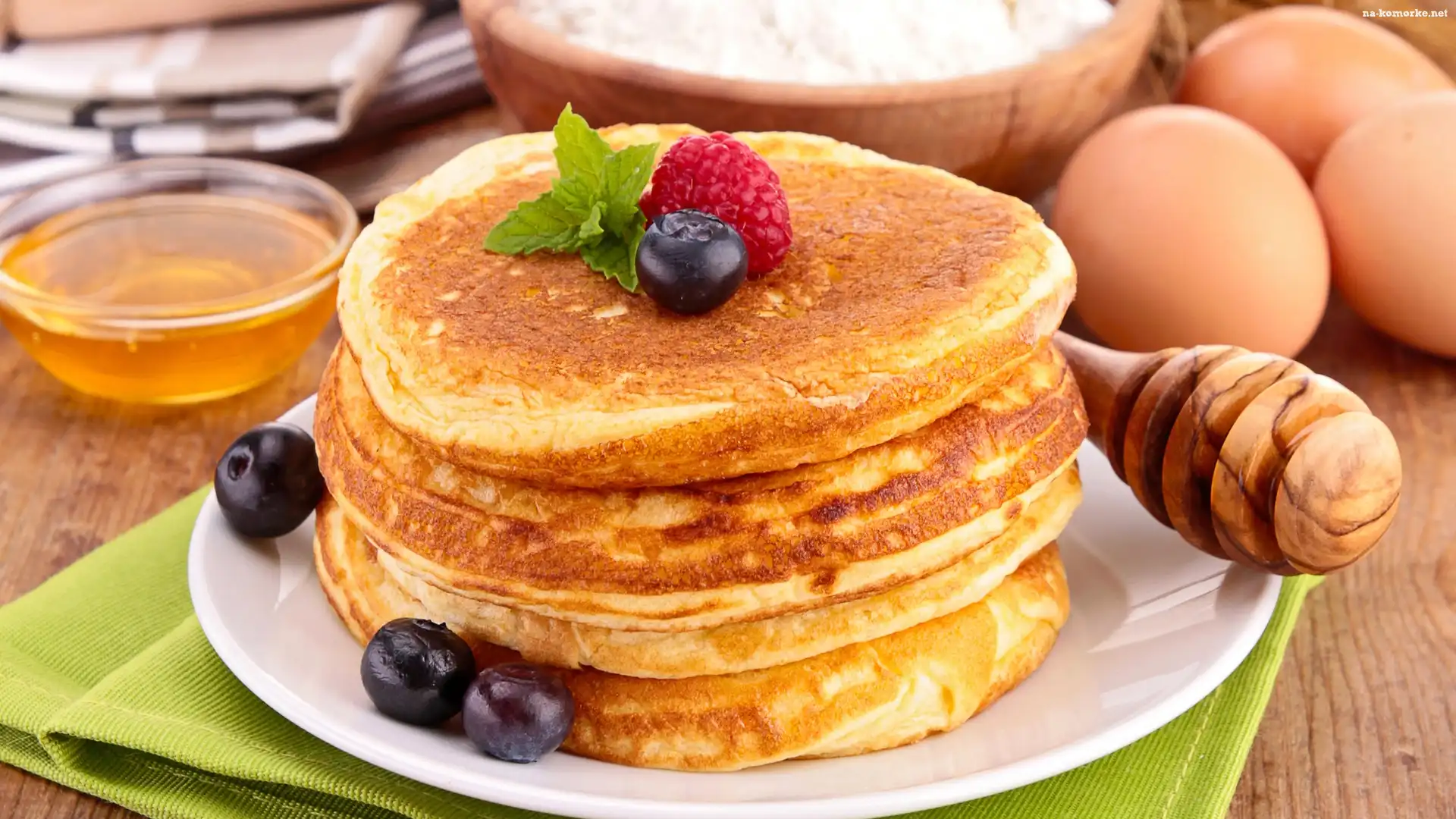 Naleśniki, Jajka, Talerz, Łyżka, Owoce, Miski, Miód, Mąka na Komórkę