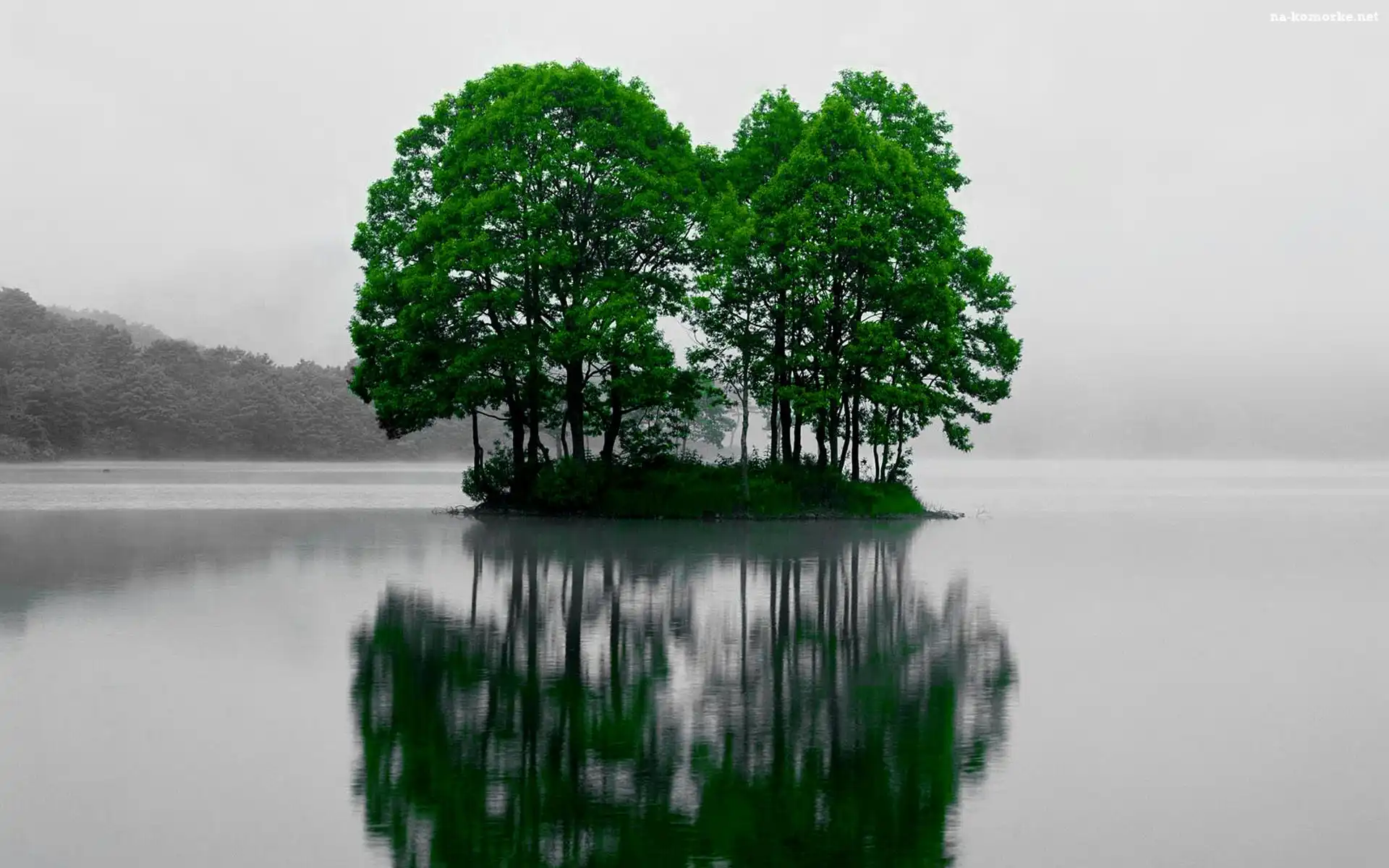 Japonia, Jezioro, Wysepka, Drzewa, Sohara na Komórkę