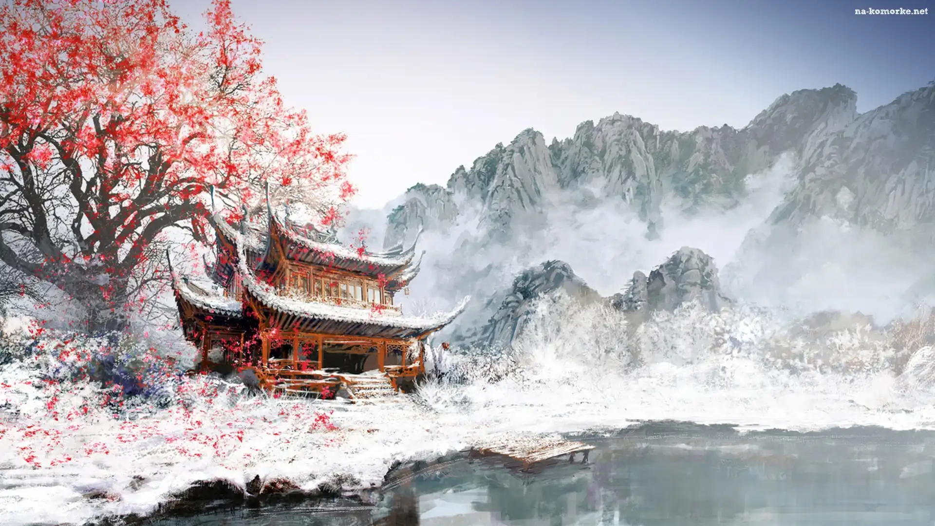 Japoński, Zima, Góry, Drzewo, Domek na Komórkę