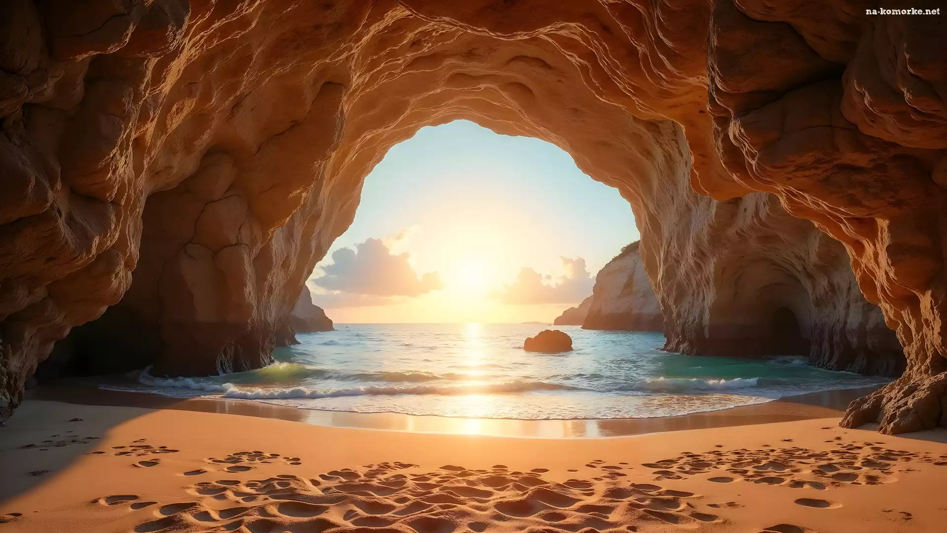 Morze, Skały, Piasek, Jaskinia, Zachód słońca na Komórkę