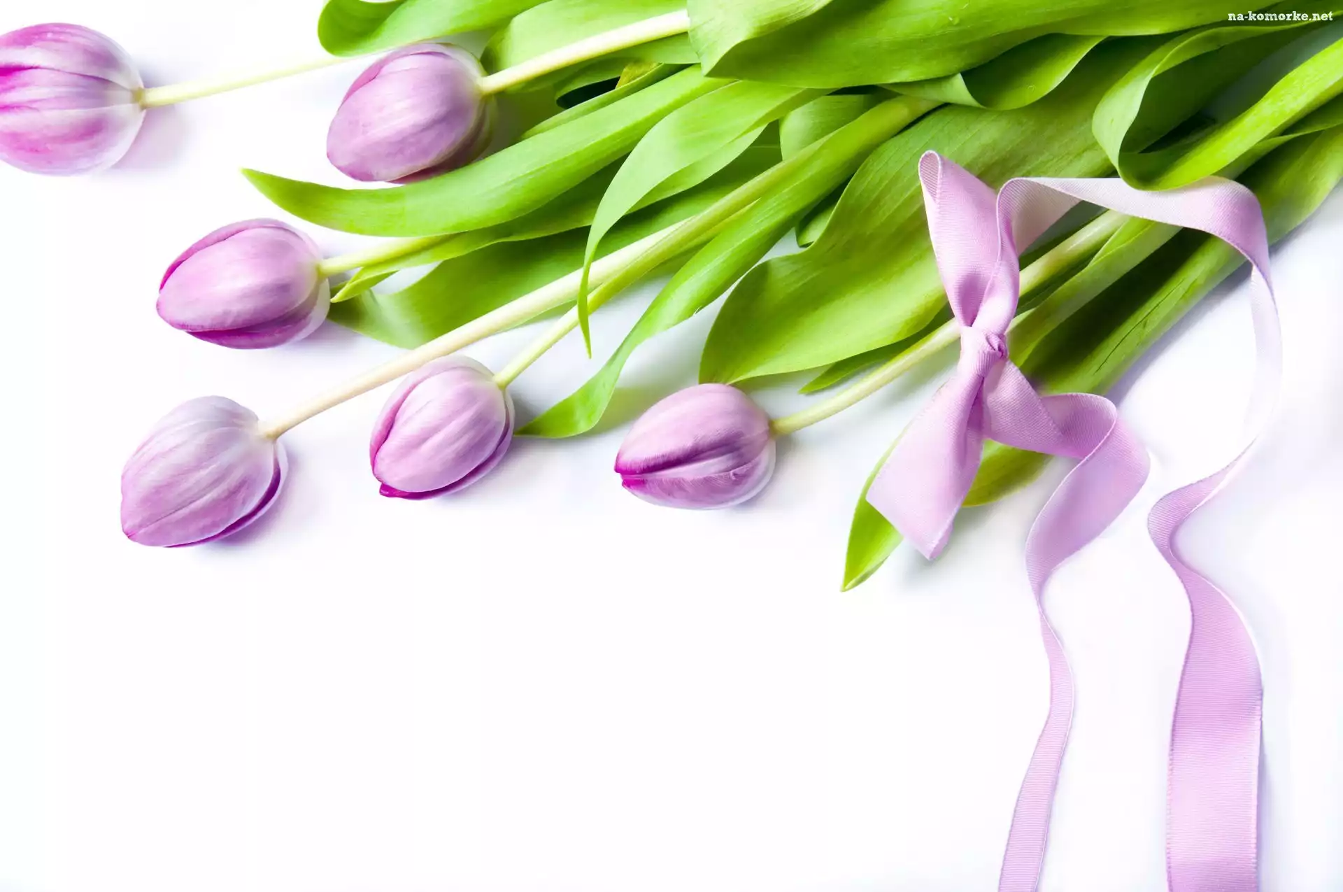 Jasnofioletowe, Białe Tło, Tulipany, Wstążka na Komórkę