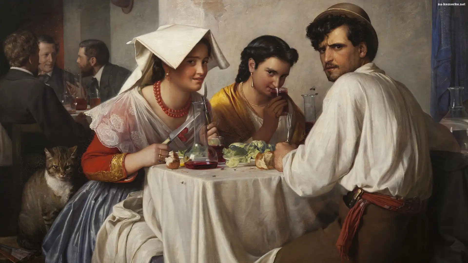 Malarstwo, Restauracja, Jedzenie, Carl Bloch, Stolik, Kot, Obraz, Dwie, Kobiety, Mężczyźni na Komórkę |
