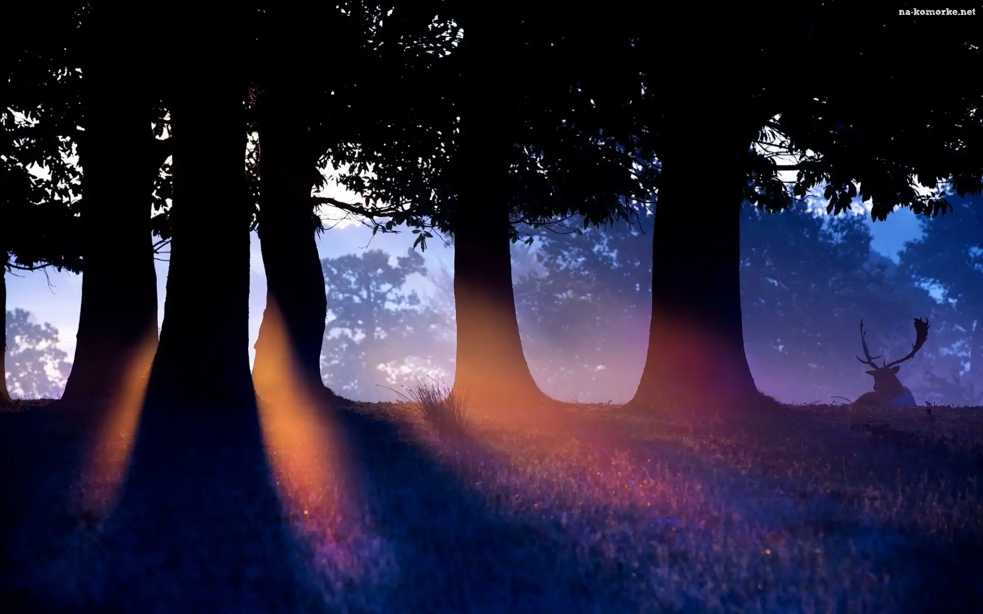 Jeleń, Drzewa, Mgła, Przebijające, Światło na Komórkę