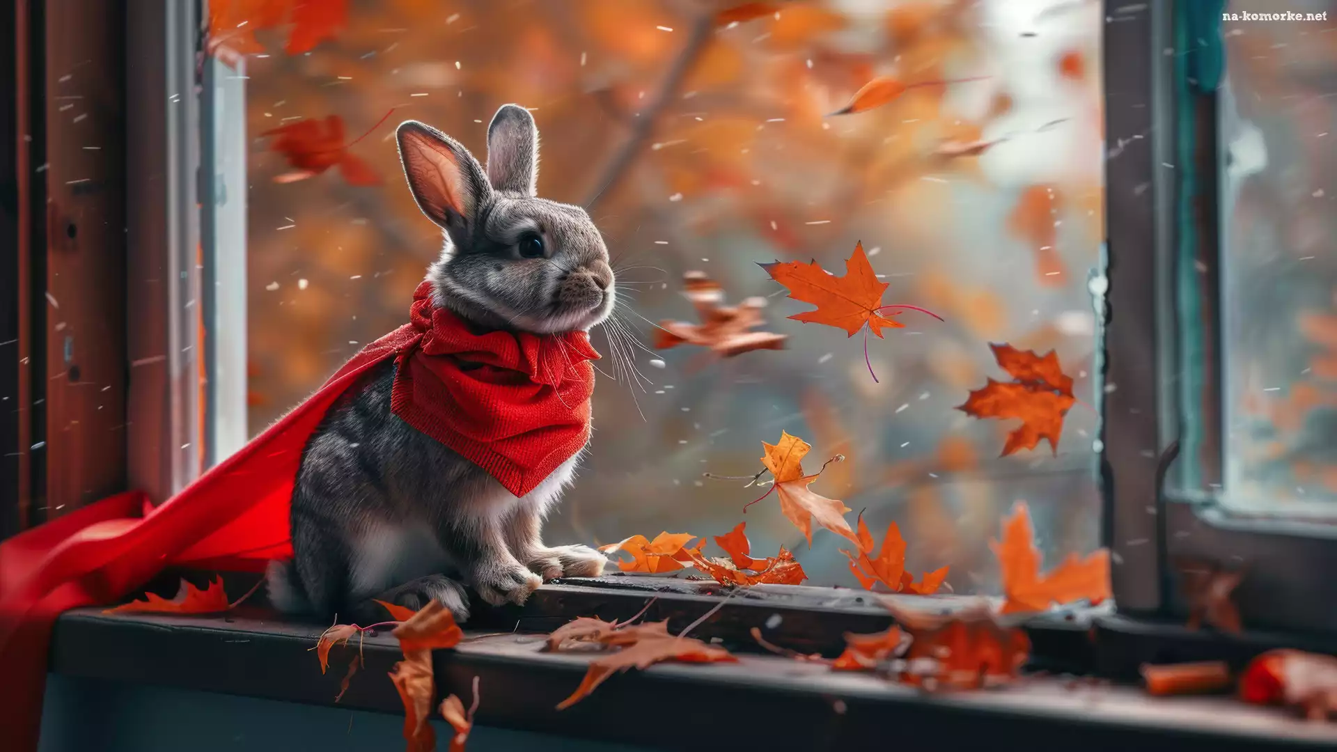 Liście, Królik, Okno, Jesień, Szal, Czerwony na Komórkę