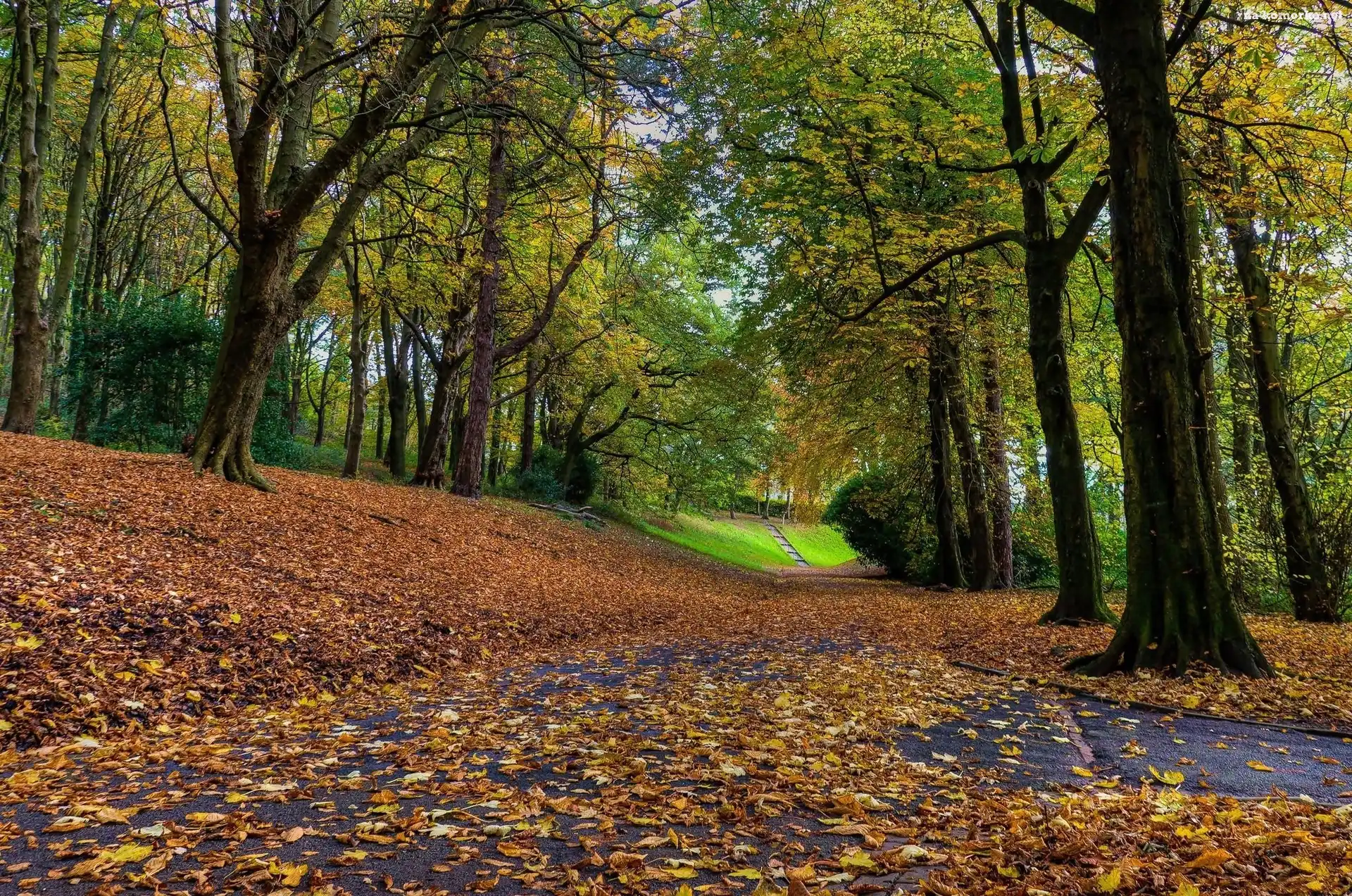 Jesień, Park, Alejki, Drzewa, Liście na Komórkę