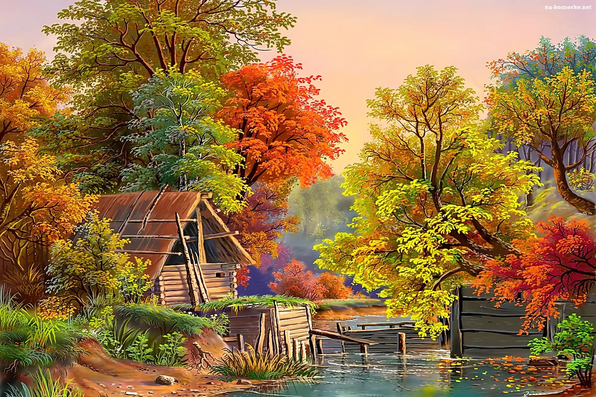 Jesień, Staw, Domek, Malarstwo, Drzewa, Widoczek na Komórkę