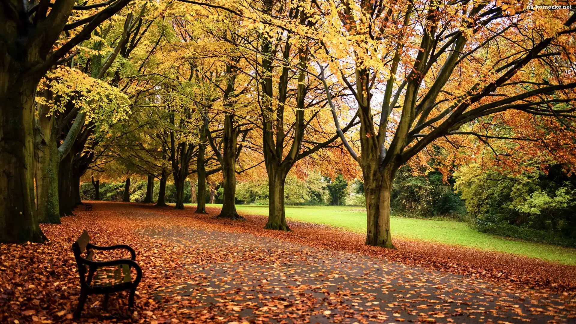 Jesień, Ławka, Park, Liście, Drzewa, Opadłe na Komórkę