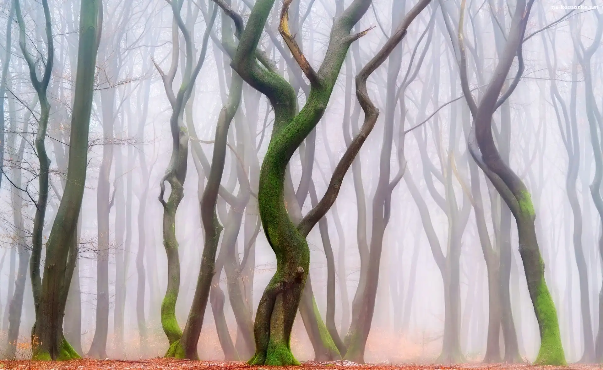 Jesień, Las, Wygięte, Drzewa, Mgła na Komórkę