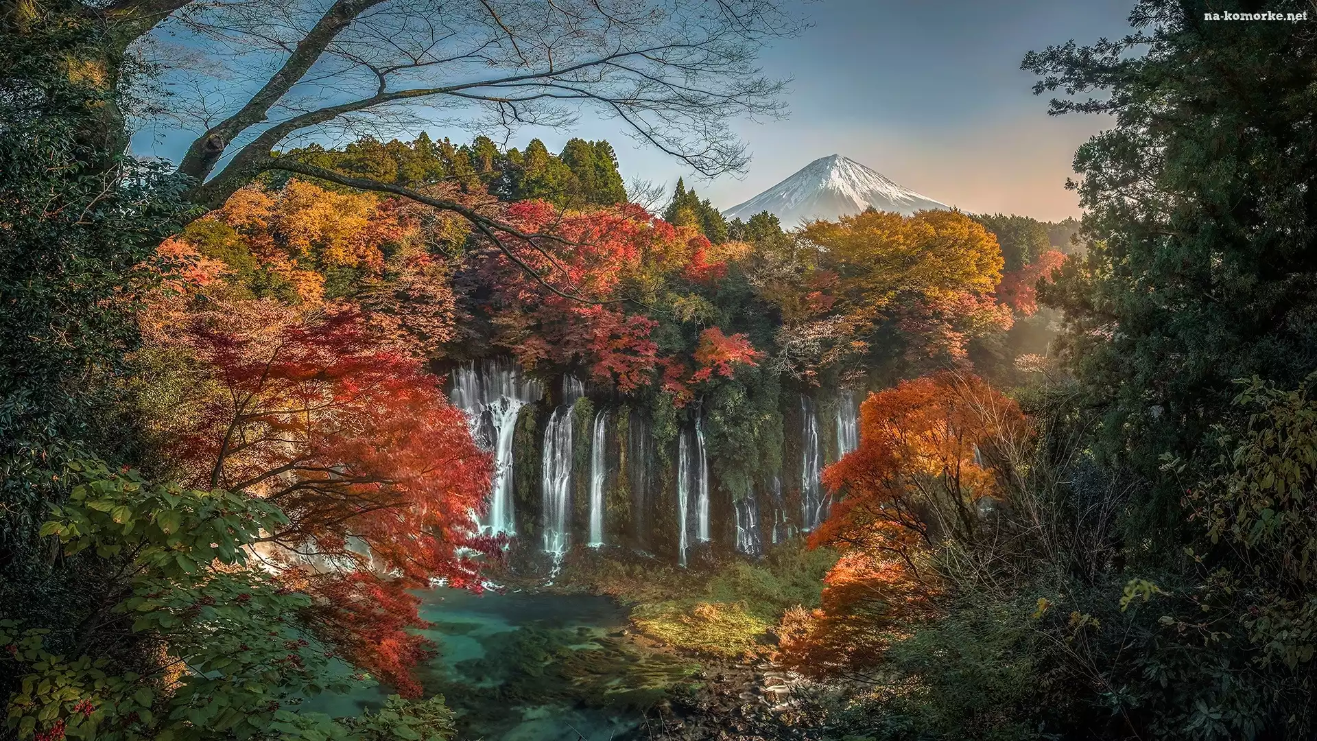 Jesień, Park Narodowy Fudżi-Hakone-Izu, Drzewa, Japonia, Liście, Gałęzie, Wieczór, Wodospad Shiraito na Komórkę |