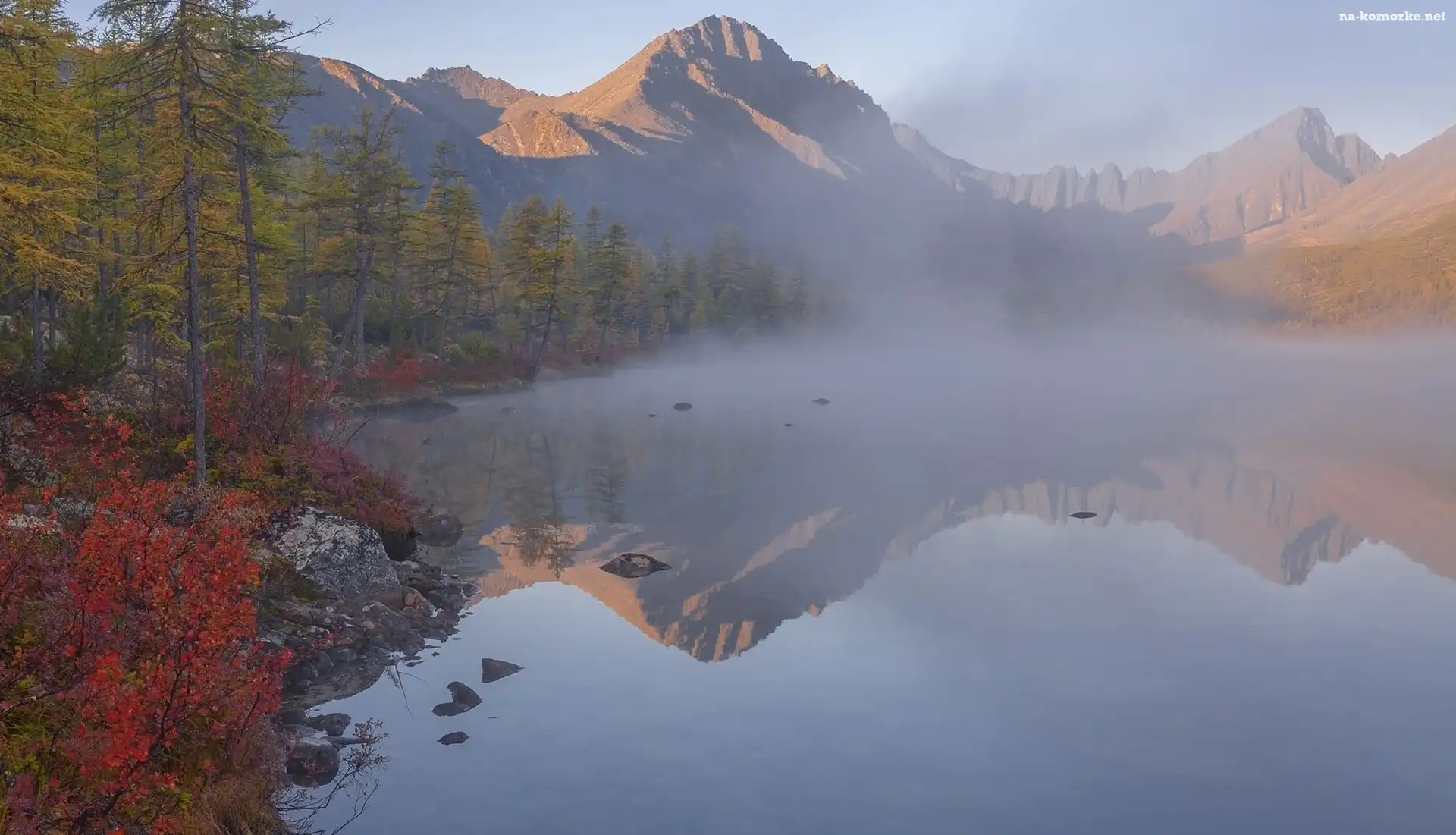 Jesień, Krzewy, Drzewa, Jezioro Jack London, Rosja, Góra Angachak, Kołyma, Mgła, Obwód magadański, Odbicie, Góry Kołymskie na Komórkę |