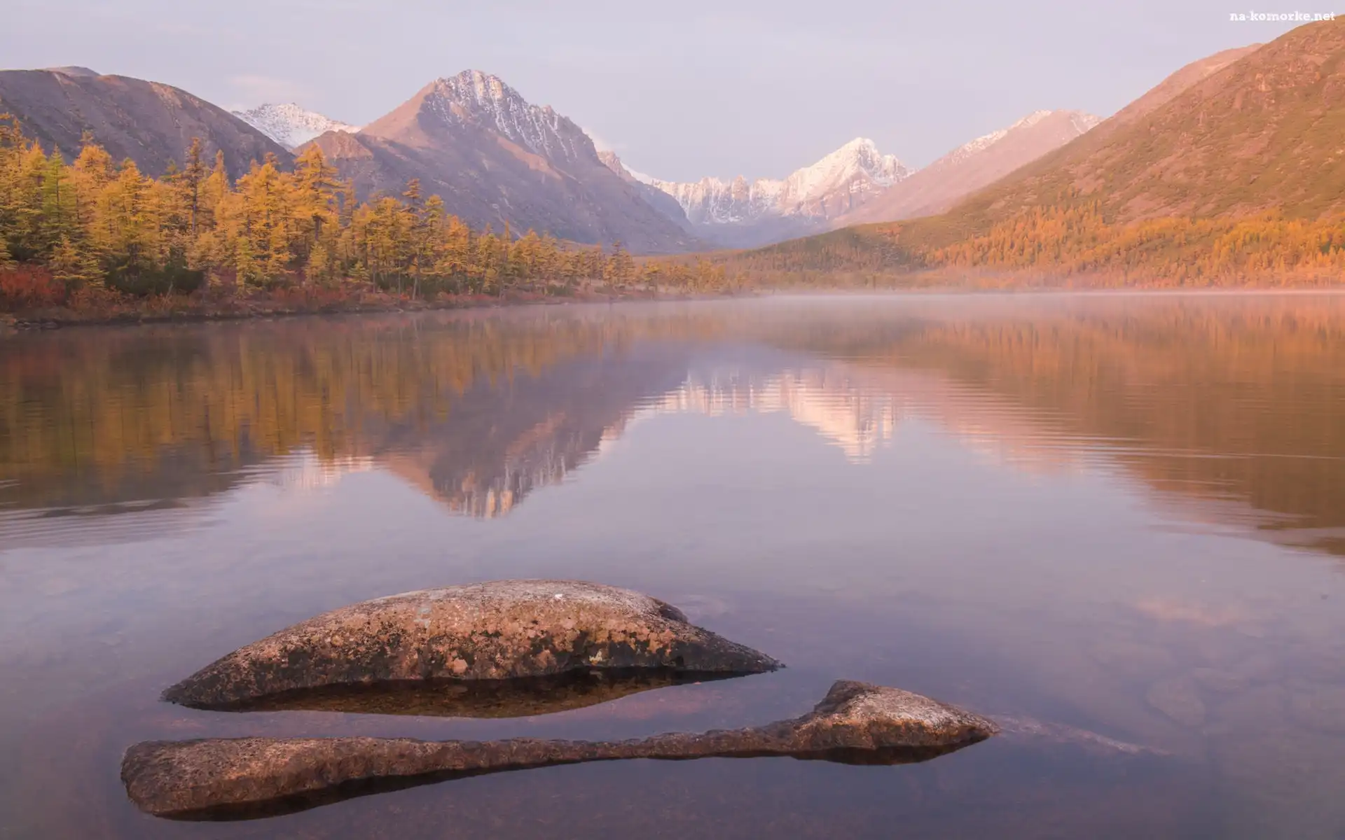 Jack London, Jesień, Drzewa, Góry Kołymskie, Rosja, Jezioro, Kołyma, Skały, Odbicie na Komórkę