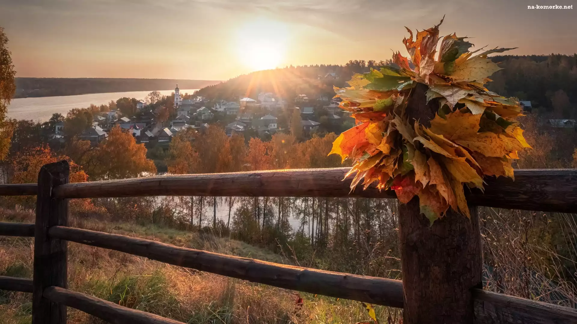 Wschód słońca, Liście, Obwód iwanowski, Klonu, Plos, Rosja, Ogrodzenie, Jesień na Komórkę