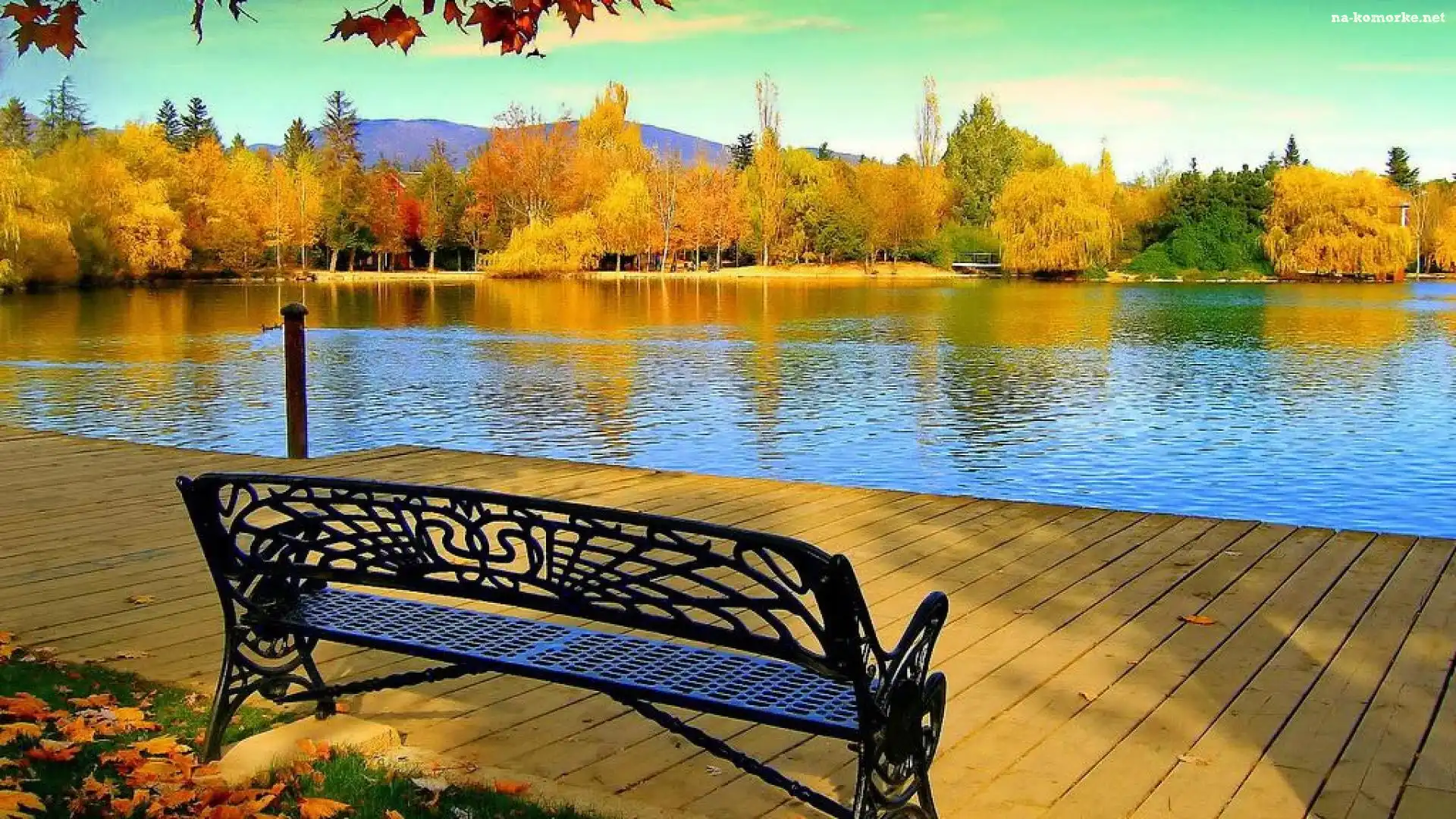 Jesień, Ławeczka, Jezioro, Drzewa na Komórkę
