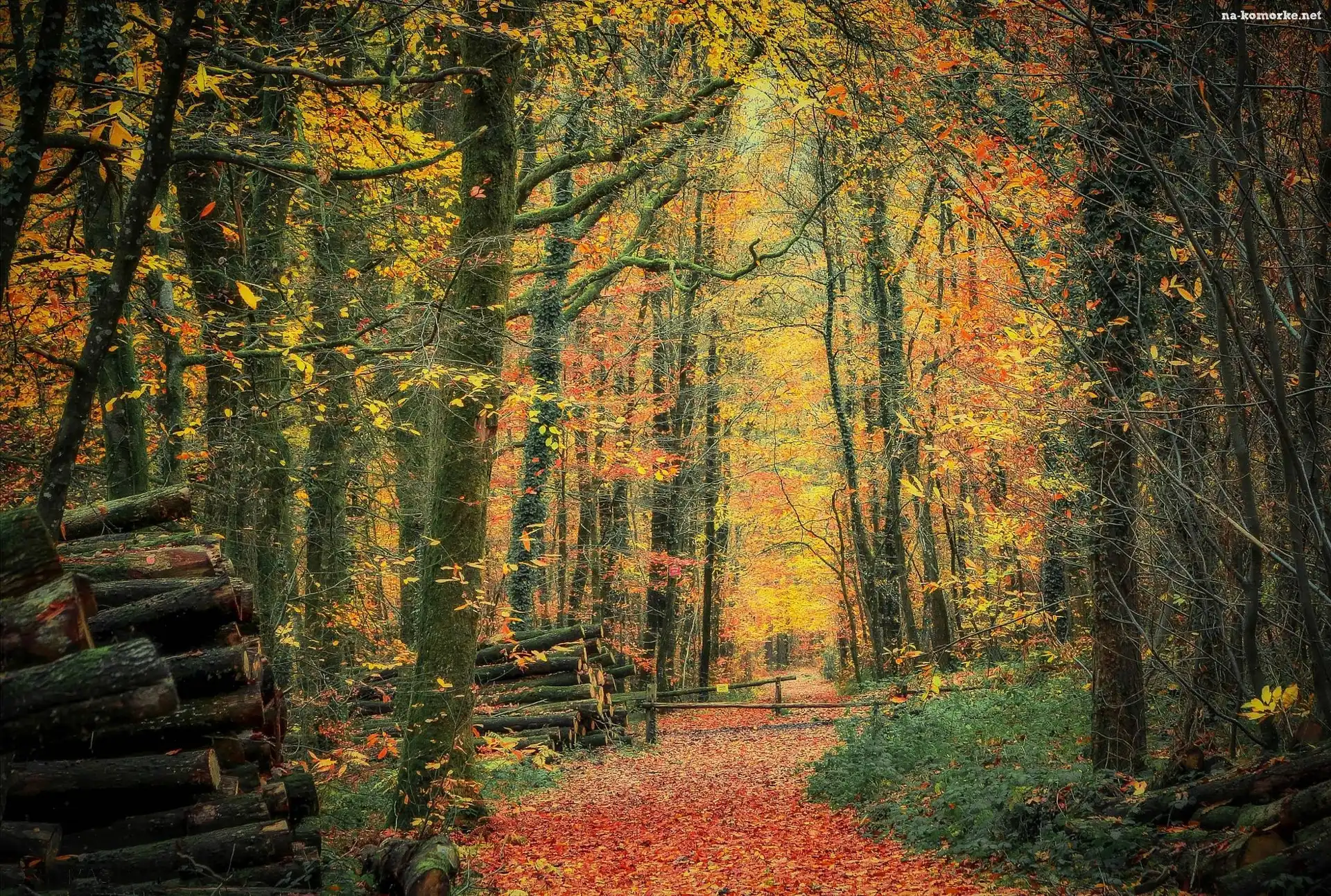 Las, Jesień, Liście, Ścięte, Pnie, Drzewa, Ścieżka na Komórkę