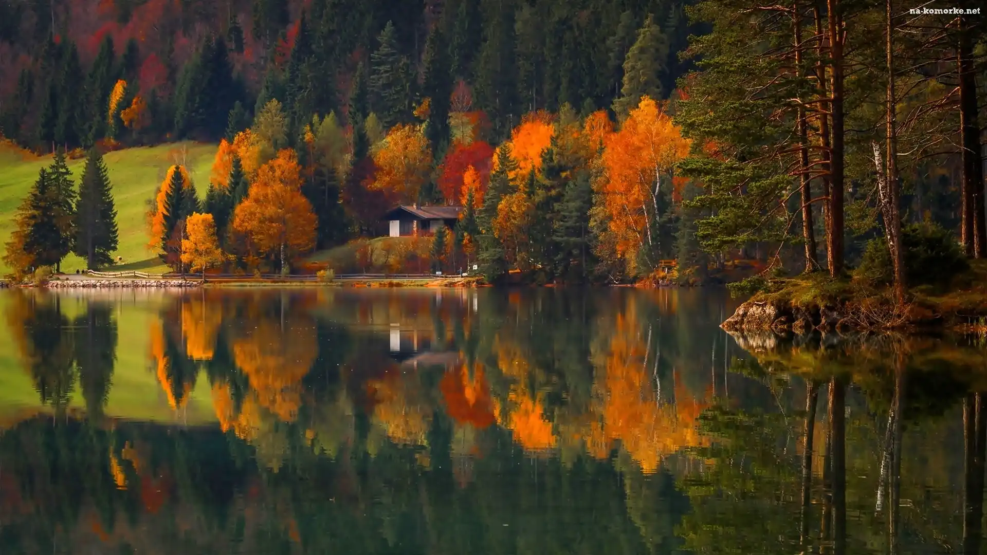 Jesień, Jezioro, Góry, Lasy, Dom na Komórkę