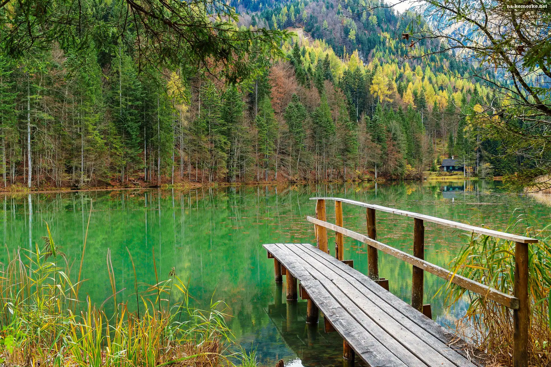 Jesień, Jezioro, Pomost, Lasy, Dom na Komórkę