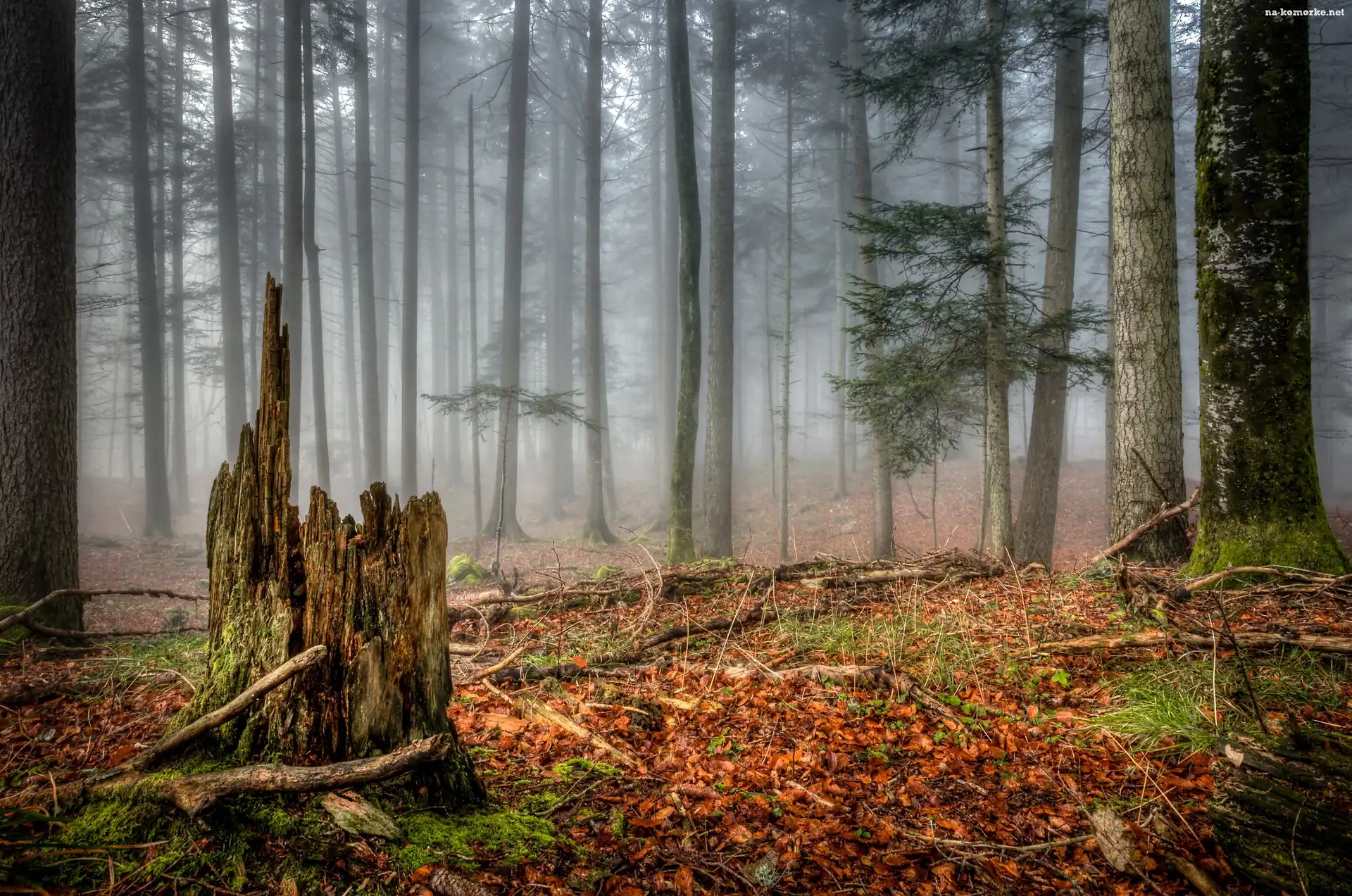 Jesień, Las, Drzewa, Liście, Mgła na Komórkę