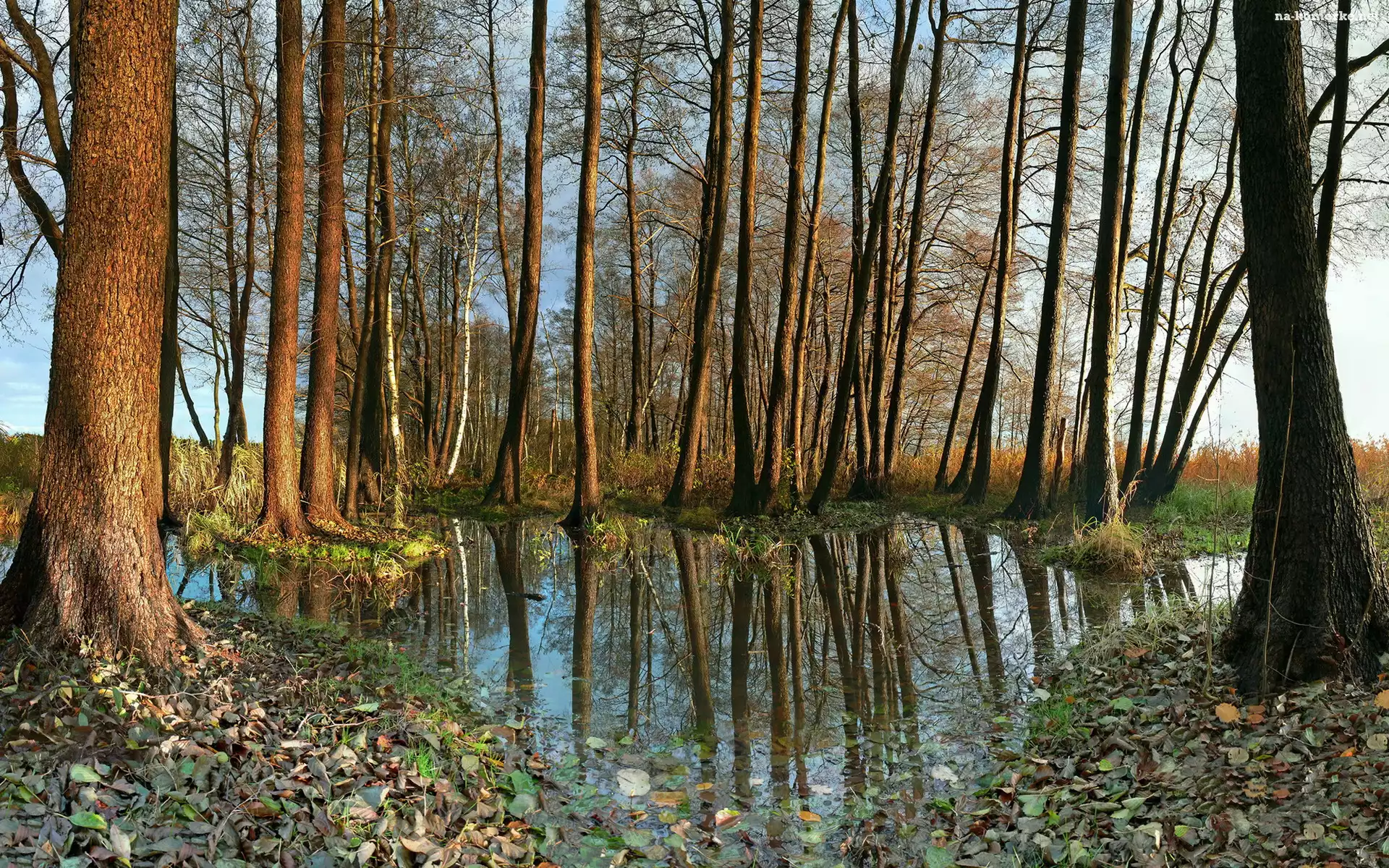 Jesień, Drzewa, Woda, Odbicie, Liście, Trawa na Komórkę