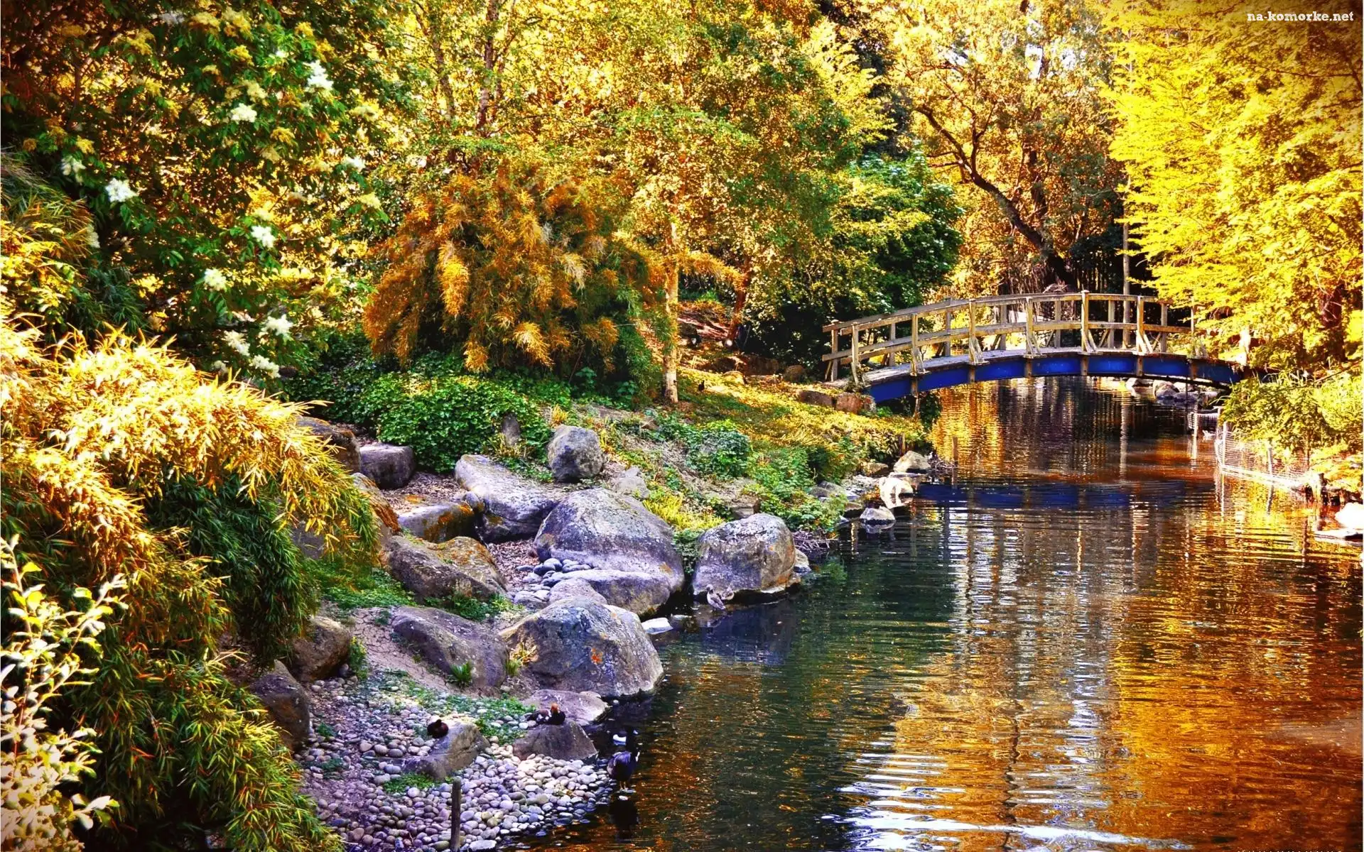 Jesień, Park, Rzeczka, Mostek, Kamienie na Komórkę