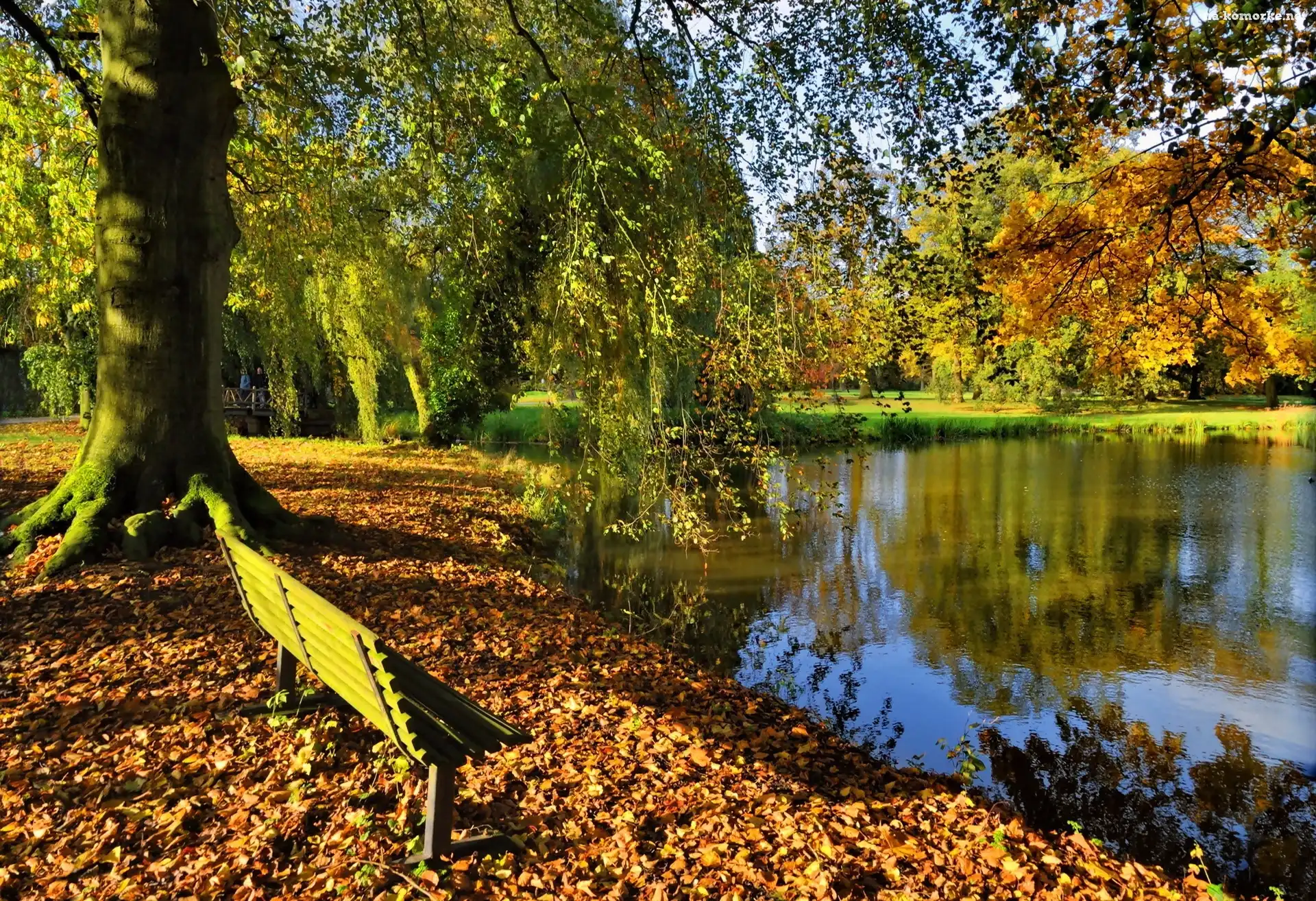 Jesień, Ławka, Park, Staw na Komórkę