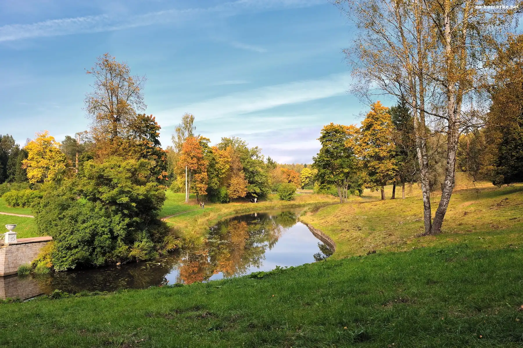 Jesień, Park, Drzewa, Rzeczka, Alejka na Komórkę