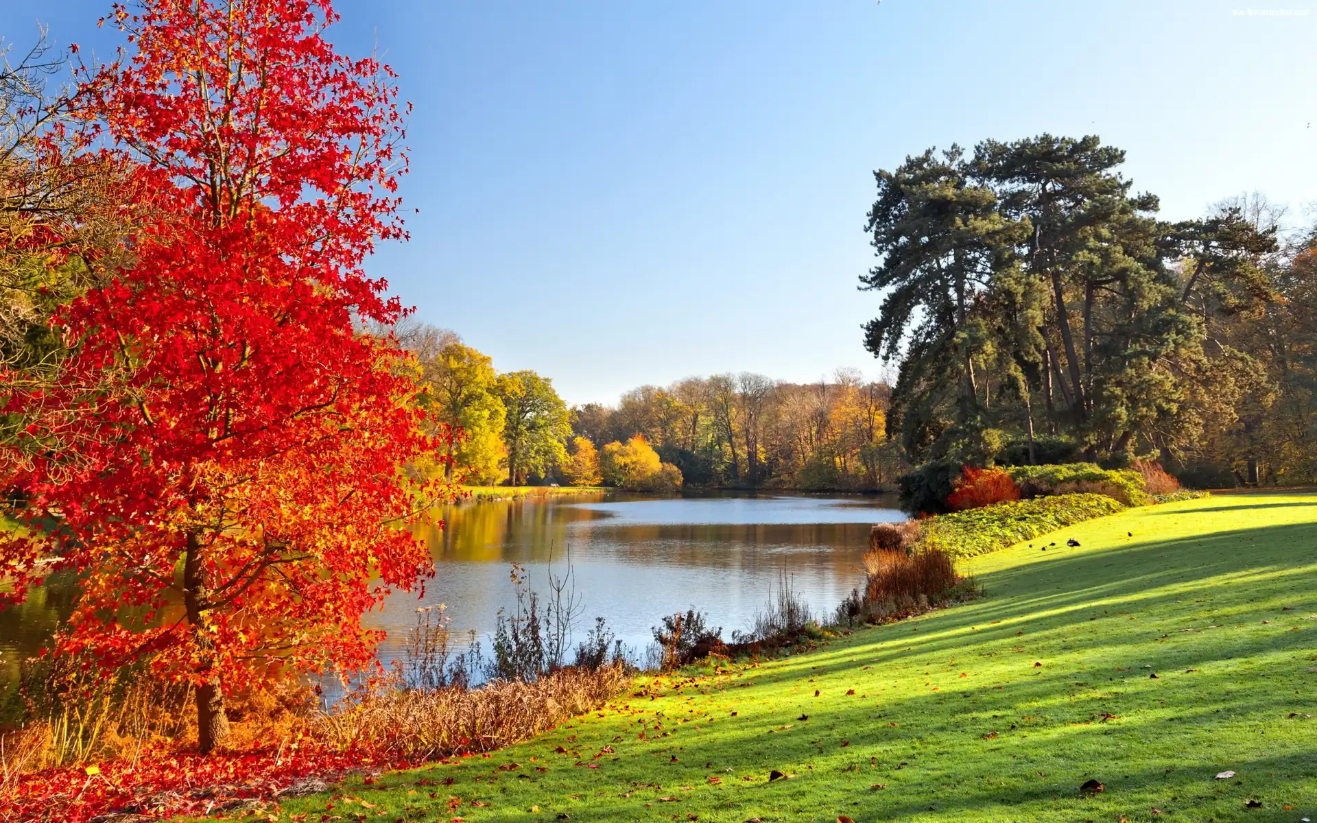 Jesień, Drzewa, Rzeka, Brzeg na Komórkę