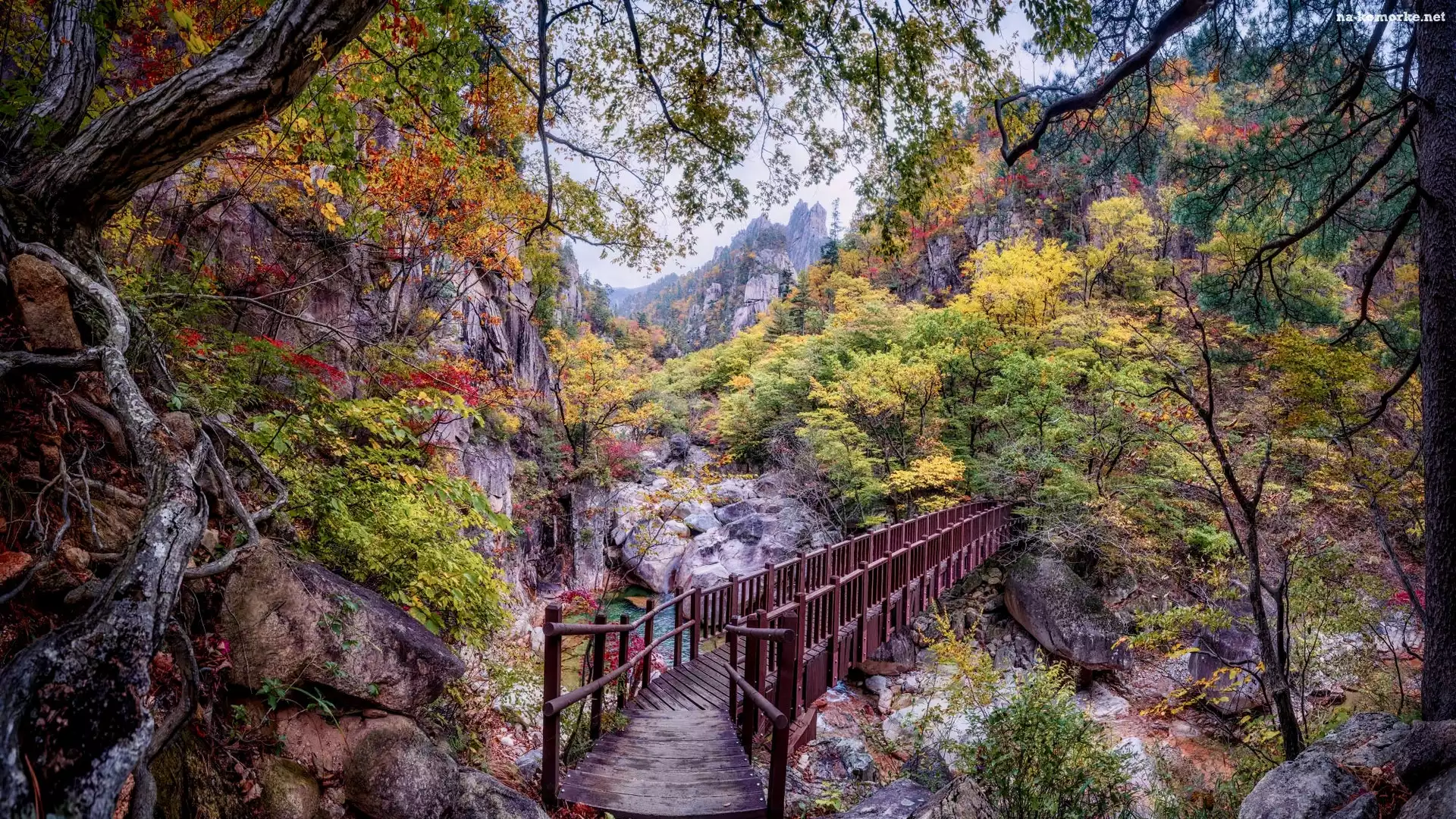 Drzewa, Góry, Mostek, Jesień, Rzeka, Skały na Komórkę
